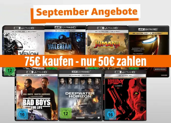 Wählt aus über 270 Titeln eure 4K Ultra HD Blu-rays im Wert von 75 Euro aus und zahlt nur 50 Euro an der Kasse! Das 50 Euro Sparpaket in den Amazon September Angebote!
