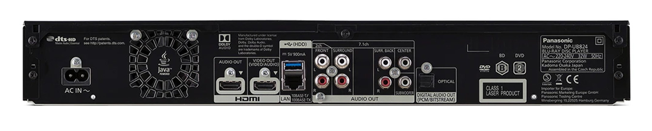 Kommen wir zu unserer Redaktionsempfehlung, dem Panasonic DP-UB824. Dieses Modell verrichtet nicht nur in unserer Redaktion ihren Dienst, sondern auch in den privaten Räumen des Autors dieses Beitrags. Wenn man mit einem Anschaffungspreis von knapp 390 Euro ohne Gewissensbisse leben kann, ist der Panasonic DP-UB824 wohl die beste Wahl. Das Modell unterstützt alle geläufigen Standards und Formate (4K, 60p, HLG, HDR10, HDR10+, Dolby Vision, Dolby Atmos, DTS:X), ist mit dem leistungsstarken HCX-Prozessor ausgestattet und bietet zusätzliche Features für die Audiowiedergabe. So gibt es neben den Twin-HDMI-Anschlüssen auch ein analoges Anschlussboard für 7.1-Sound (Cinch) auf der Rückseite des Players. Dazu gesellen sich noch ein Ethernet-Anschluss (LAN) und zwei USB-Anschlüsse, über die Dateien über den integrierten Mediaplayer wiedergegeben werden können.