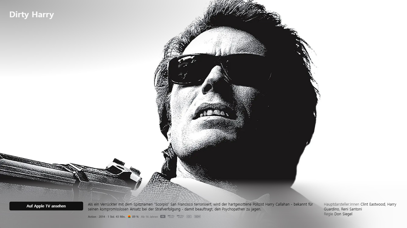 Clint Eastwood „Dirty Harry“ (4K/HDR/Dolby Vision/Atmos) auf Apple TV Clint Eastwood „Der Texaner“ (4K/HDR/Dolby Vision/Atmos) auf Apple TV Neue 4K Filme auf Apple TVBild- und Audioqualität: „Dirty Harry“ und „Der Texaner“