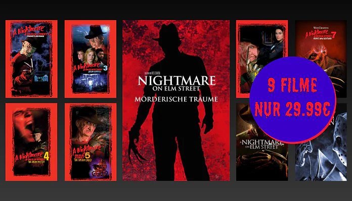 Update: Die Nightmare on Elm Street 9-Film-Complete-Collection* mit allen Filmen, in denen Freddy Krueger mitspielt, wurde von 49.99 Euro auf 29.99 Euro reduziert!  Ihr zahlt je Film somit nur 3,33 Euro.