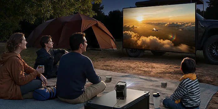- Kompaktes, tragbares Design mit großem Bildschirm: Dank des leichten Gehäuses mit integriertem Griff genießt du deine Unterhaltung überall. Freue dich auf beeindruckende Bilder auf bis zu 180 Zoll und mit bis zu 20h Akkulaufzeit – drinnen oder draußen.