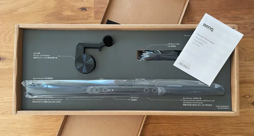 Und allein dafür lohnt sich bereits die Anschaffung einer Monitor-Tischlampe, wie der BenQ ScreenBar. Das System ist denkbar einfach, was sich bereits nach dem Öffnen der Verpackung zeigt. Dort finden wir das eigentliche Monitor-Licht, nebst Halterung und USB-Kabel (USB-A auf USB-C). Dazu gibt es noch eine kompakte Service-Information – das war es auch schon. Die Verbindung der Lichtleiste mit dem Halterung-Klip ist supereinfach. Danach stecken wir das USB-C-Kabel in die ScreenBar (durch die dafür vorgesehene Führung) und danach können wir das Gerät bereits an den Monitor anbringen. Das Gewicht sowie der Clip erlaubt es, die ScreenBar an Monitoren mit einer maximalen Dicke von 3cm zu installieren. Selbst bei einem gebogenem Display, wie ich eines nutze, gibt es keine Probleme. Für die Stromversorgung wird ein USB-A-Anschluss mit 5V/1A benötigt. Ich kann die BenQ ScreenBar somit direkt über einen der USB-Anschlüsse meines Widescreen-Monitors mit Strom versorgen. Das Marketingversprechen „Installiert in einer Minute“ kann BenQ schon einmal einhalten.