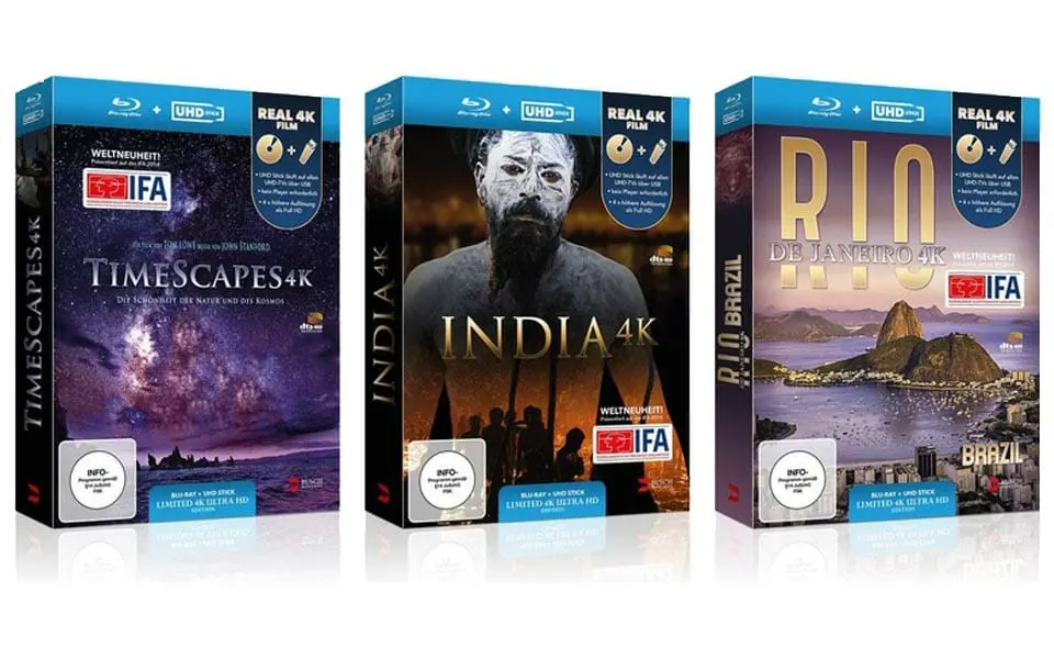 Busch Media Group präsentiert rechtzeitig zum Weihnachtsgeschäft seine weltweit einzigartigen Blu-ray-Bundles die einen hochwertigen Film sowie das jeweilige 4K-Material auf USB-Stick beinhalten. Die Filme „Timescapes“, „Fascinating India“, „Rio de Janeiro“, „Kaminfeuer“ und „Aquarium“ werden ab 28. November 2014 in limitierter Auflage in den Handel kommen.