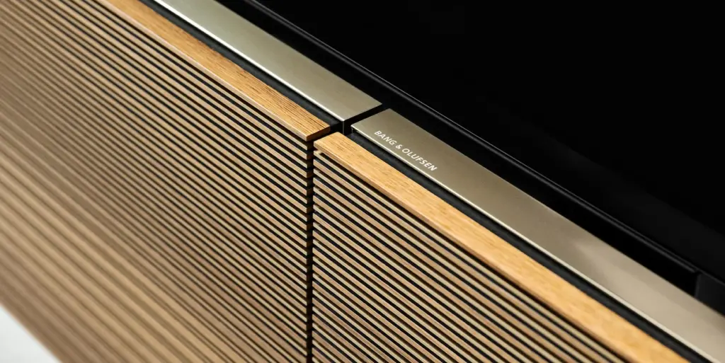 Das Besondere am BeoVision Harmony 88 ist sein Aufbau und die verwendeten Materialien. Edelste Hölzer (Walnuß und Eiche) treffen auf gebürstetes Aluminium. Alles sitzt perfekt und wirkt wie aus einem Guss. Das Highlight sind die beweglichen Lautsprecher-Segmente hinter denen sich das 8K-OLED-Display im deaktivierten Zustand versteckt. Wird der TV aktiviert, fährt das Display nach oben und die Lautsprecher „öffnen“ sich wie die Flügel eines Schmetterlings. Klanglich überzeugt das System mit einem 3.1-Aufbau mit zwei starken Subwoofern. Über den kabellosen Lautsprecher-Standard WiSA lässt sich das Klangerlebnis auf ein 7.1 System erweitern. Gesteuert wird das ganze mit der BeoRemote ONE (Fernbedienung), die aus einem Stück gerolltem Aluminium gefertigt wurde.