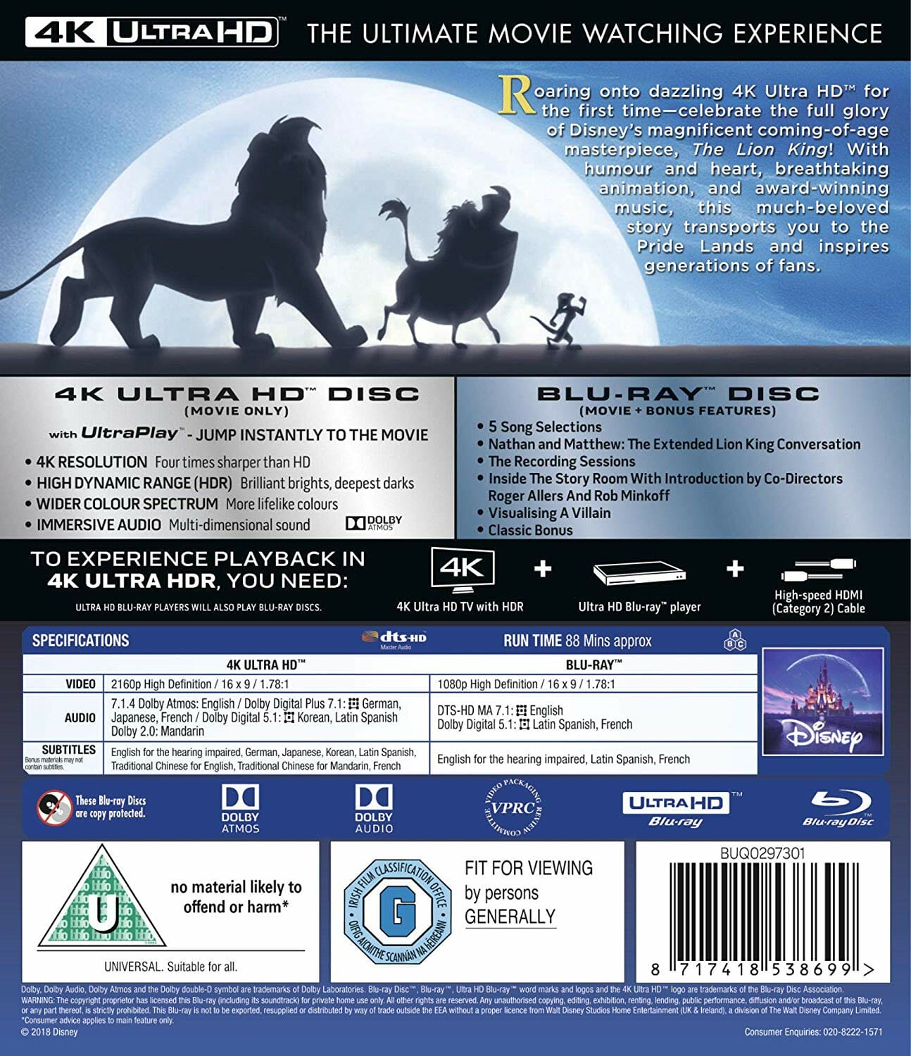 Update 23-10-2018: Disney hat die 4K Blu-ray zum 1994-Zeichentrick-Klassiker „Der König der Löwen“ bestätigt. Ein Blick auf die Rückseite der US-Version verrät uns auch bereits die Ausstattung. Ein 4K Remaster mit HDR10, englischem Dolby Atmos Ton und eine deutsche Tonspur in Dolby Digital Plus 7.1. Das ist eine übliche Konfiguration für Disneys 4K UHD Blu-rays, nachdem das Unternehmen das dynamische HDR-Format „Dolby Vision“ nicht mehr für seine physischen UHD-Veröffentlichungen unterstützt. Leider scheint es keine neuen Extras zu geben. Der Umfang des Bonus-Materials entspricht der regulären 1080p Blu-ray.