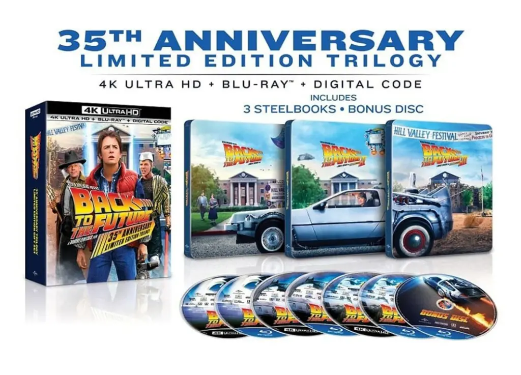 Wer sich die Filme sowieso im englischen Originalton ansehen und nicht auf die Amaray-Varianten warten möchte, der kann sich vielleicht das besondere „Back to the Future 35th Anniversary Trilogy Giftset“ aus den USA ordern. Das Besondere? In der Box ist neben der Trilogie auch ein mehrseitiges Buch zum Film sowie eine Mini-Replika eines wirklich schwebenden Hoverboards enthalten – natürlich von Mattel! Schade, dass die deutsche Variante „nur“ als Steelbook erscheint und nicht mit solchen Goodies ausgeliefert wird.