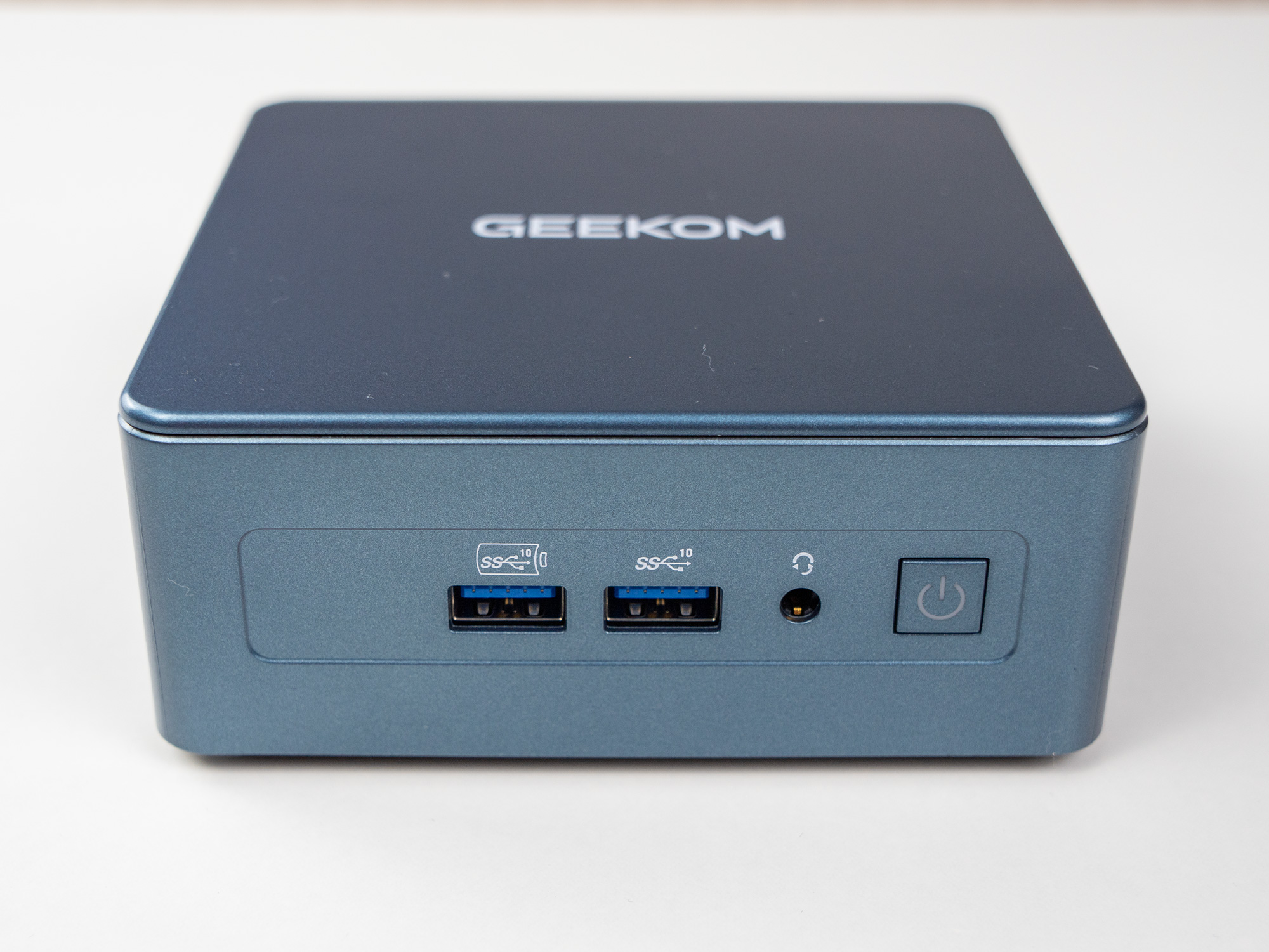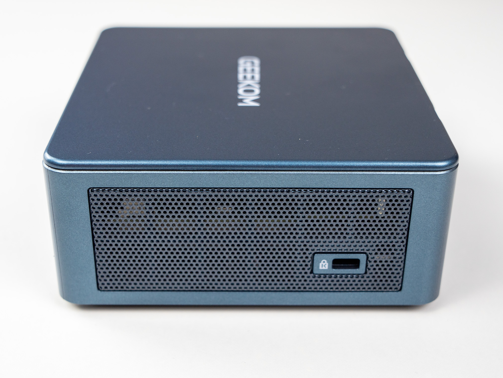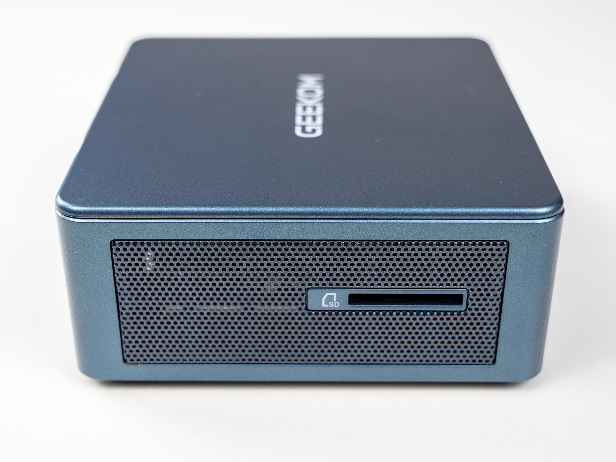 An der Vorderseite des Mini-PCs befinden sich zwei weitere USB 3.2-Anschlüsse mit 10 Gbit/s und ein kombinierter Mikrofon-Kopfhörer-Steckplatz (3.5mm Klinkenstecker). An den Seiten finden wir zudem einen Anschluss für ein Kensington-Lock sowie einen SD-Kartenleser.