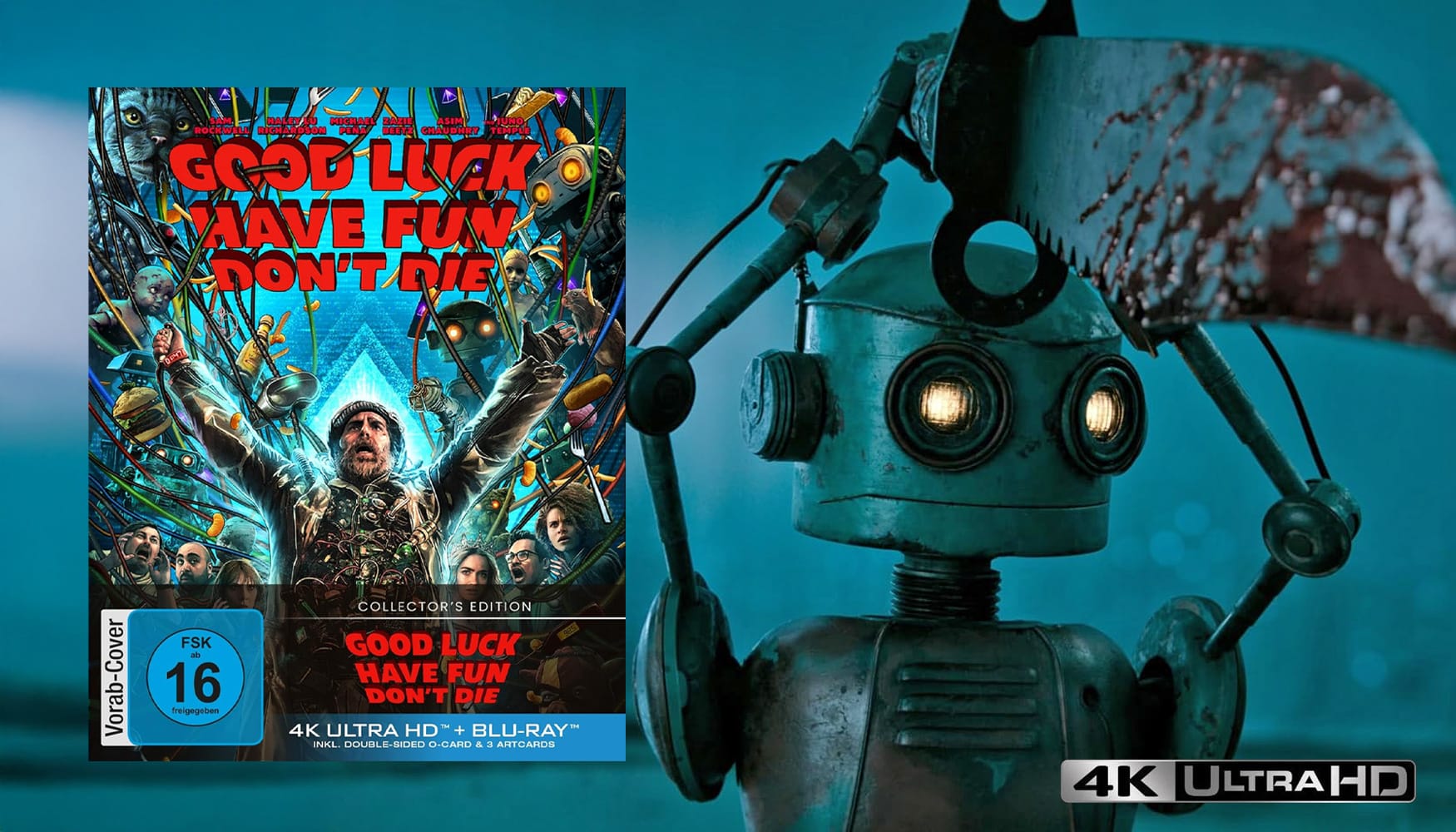 „Good Luck, Have Fun, Don’t Die“ wird als laute Kritik an der derzeitigen KI-Entwicklung gesehen. Viele vergleichen den Film auch mit einer Folge der Netflix-Erfolgsserie „Black Mirror“, jedoch in Spielfilmlänge. Der Debüt-Trailer fängt den „Vibe“ des Films perfekt ein (was bei Trailern ja nicht immer der Fall ist), und so kann man ziemlich gut einschätzen, ob man sich der Kombination aus Sozialkritik, Science-Fiction und Klamauk hingeben möchte. Wer sich in den eigenen vier Wänden überraschen lassen oder den Film nach der ersten Sichtung im Kino in seine Filmsammlung aufnehmen möchte, bekommt jetzt die Chance dazu. Für Fans hochwertiger Heimkino-Unterhaltung hat Constantin Film eine 4K Ultra HD Blu-ray (Collectors Edition) nebst DVD und HD Blu-ray angekündigt:
