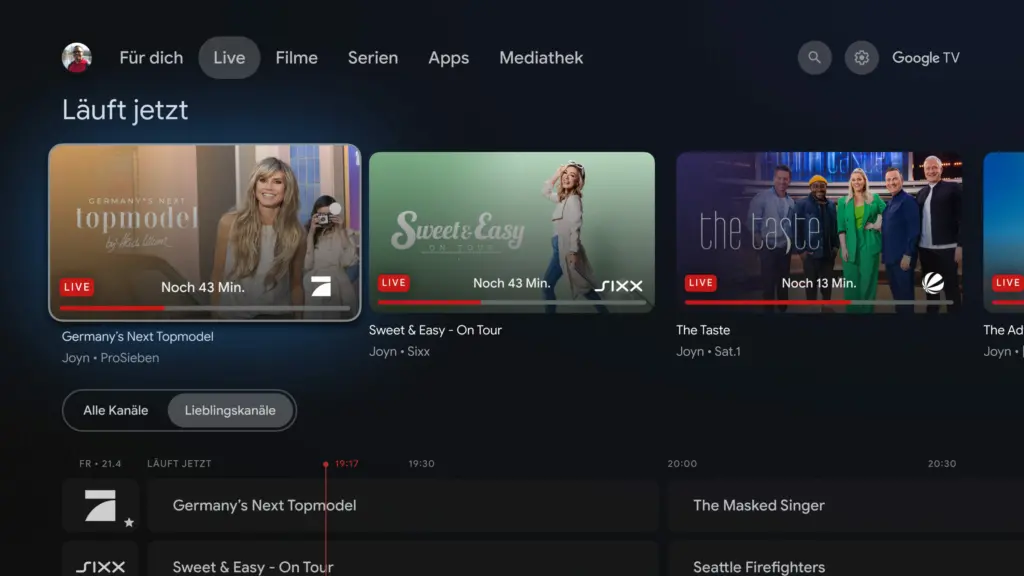 Google integriert damit also neue Funktionen zur Programmübersicht, Suche und auch Sendungs-Empfehlungen (= Werbung) in Google TV für Nutzer der Live-TV-Anbieter Joyn und Zattoo in Deutschland. Die neuen Navigationsmöglichkeiten sind über den erwähnten Live-TV-Tab auf dem Google-TV-Homescreen zu finden. Laut Google erhöhe sich so der Komfort bzw. es sei möglich, schneller auf gewünschte Inhalte zuzugreifen.