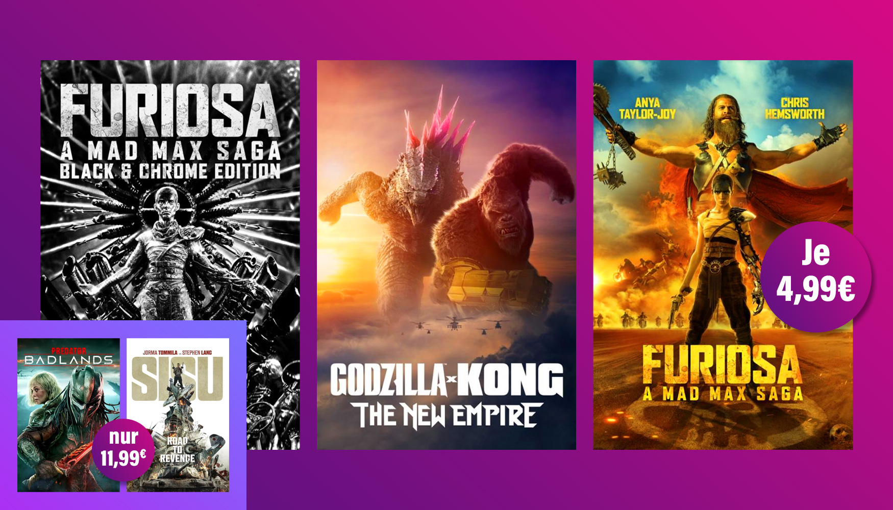 Apple TV hat seine Film-Angebote nochmals aufgewertet und ein paar zusätzliche Titel in die Auswahl ab 3,99 Euro geworfen. Dort finden wir z.B. mehrere reduzierte Filme aus den Film-Universen von „Mad Max“, „Godzilla“ und „King Kong“ wieder. Diese Angebote sollen euch wohl auf die neuesten Highlight-Angebote vorbereiten. Denn zum ersten Mal überhaupt (bzw. seit mehreren Monaten) steht „Furiosa: A Mad Max Saga“ und „Godzilla X Kong: The New Empire“ zum Schnäppchenpreis von nur 4,99 Euro zum digitalen Kauf bereit. Bei „Furiosa“ gilt der Preis übrigens auch für die künstlerisch anspruchsvolle „Black & Chrome Edition“ (separates Produkt).