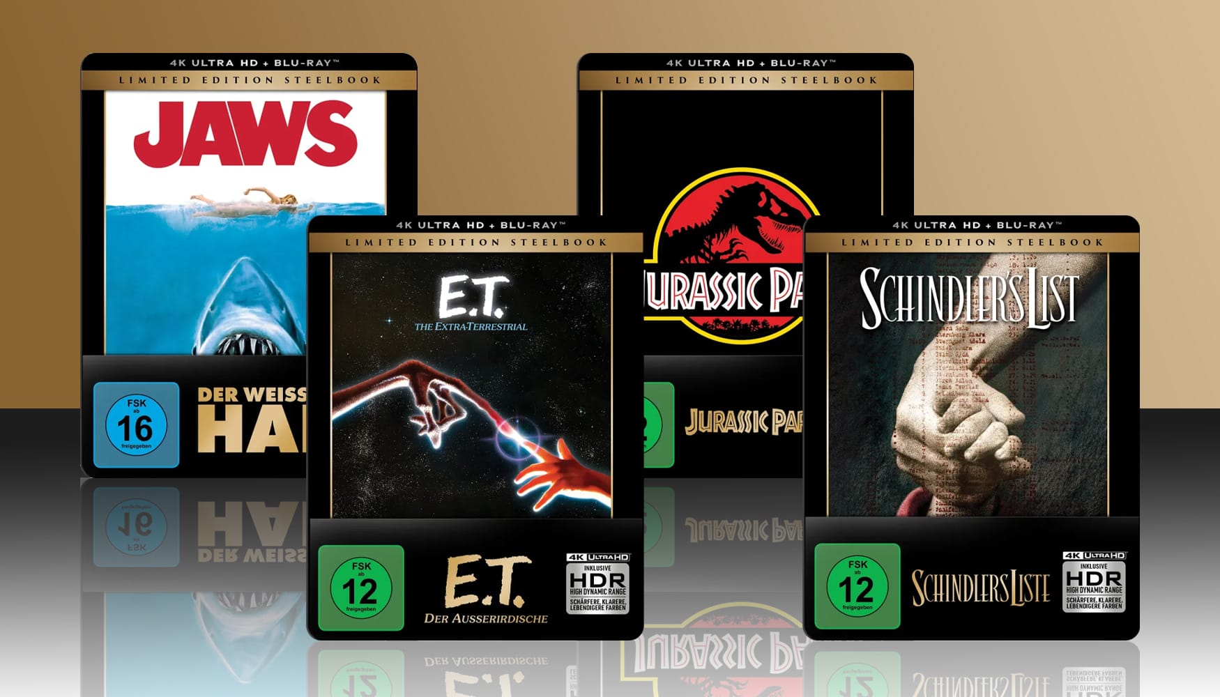 Plaion Pictures bringt vier Filmklassiker des Regisseurs Steven Spielberg in limitierten 4K Blu-ray Steelbooks mit gleichem Cover-Artwork in den Handel. Neben „Der weiße Hai“, „Schindlers Liste“, „E.T. – Der Außerirdische“ und „Jurassic Park“ erwarten euch noch weitere Film-Neuheiten, darunter ein Steelbook zu „Warcraft“, welches neben der 4K Blu-ray auch die 3D-Version des Films enthält. Nur solange der Vorrat reicht!