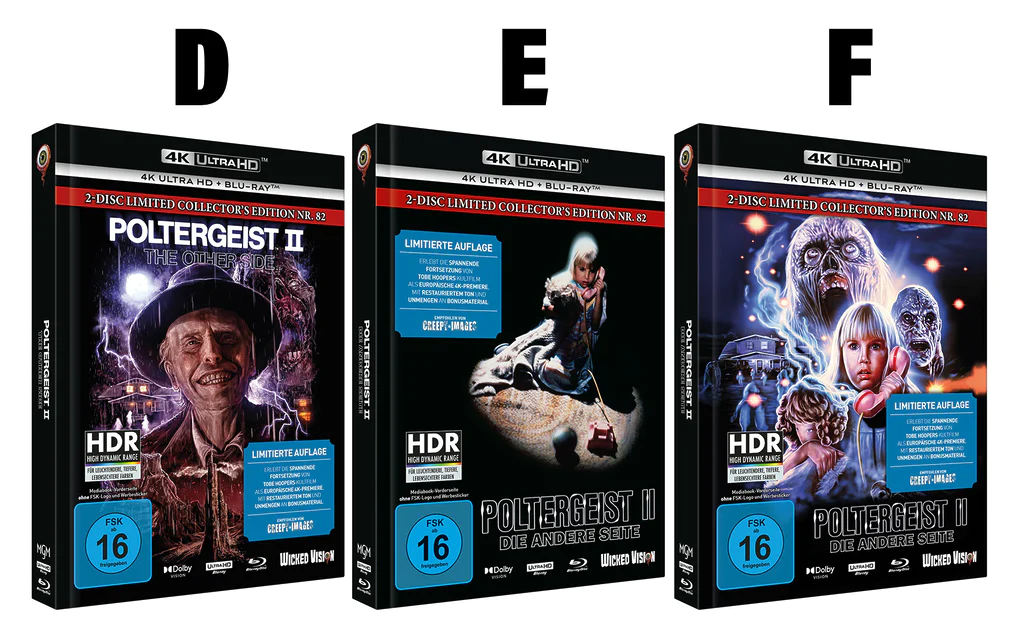 Nicht verwirren lassen. Die 4K Ultra HD Blu-rays zu „Poltergeist 2“ werden mit den Cover-Varianten D-F aufgeführt. Das hat den Grund, dass bereits drei Mediabooks (Cover A-C) in den Handel gebracht wurden. Diese beinhalteten jedoch nicht die 4K UHD-Fassung. Somit bekommen wir erstmals die Chance, den zweiten Teil der Horror-Trilogie auf 4K Blu-ray zu sichern. Der Releasetermin ist voraussichtlich der 06. Februar 2026. Derzeit sammelt Wicked Vision Bestellungen, um im Nachgang die Limitierung der Editionen festzulegen. So kann sichergestellt werden, dass alle, die sich für die Horrorklassiker interessieren, auch ein Exemplar erhalten, ohne Angst haben zu müssen, dass die Mediabooks unendlich oft nachproduziert werden – also einen gewissen Sammlerwert erhalten. Bei folgenden Händlern können die 4K Mediabooks vorbestellt werden: