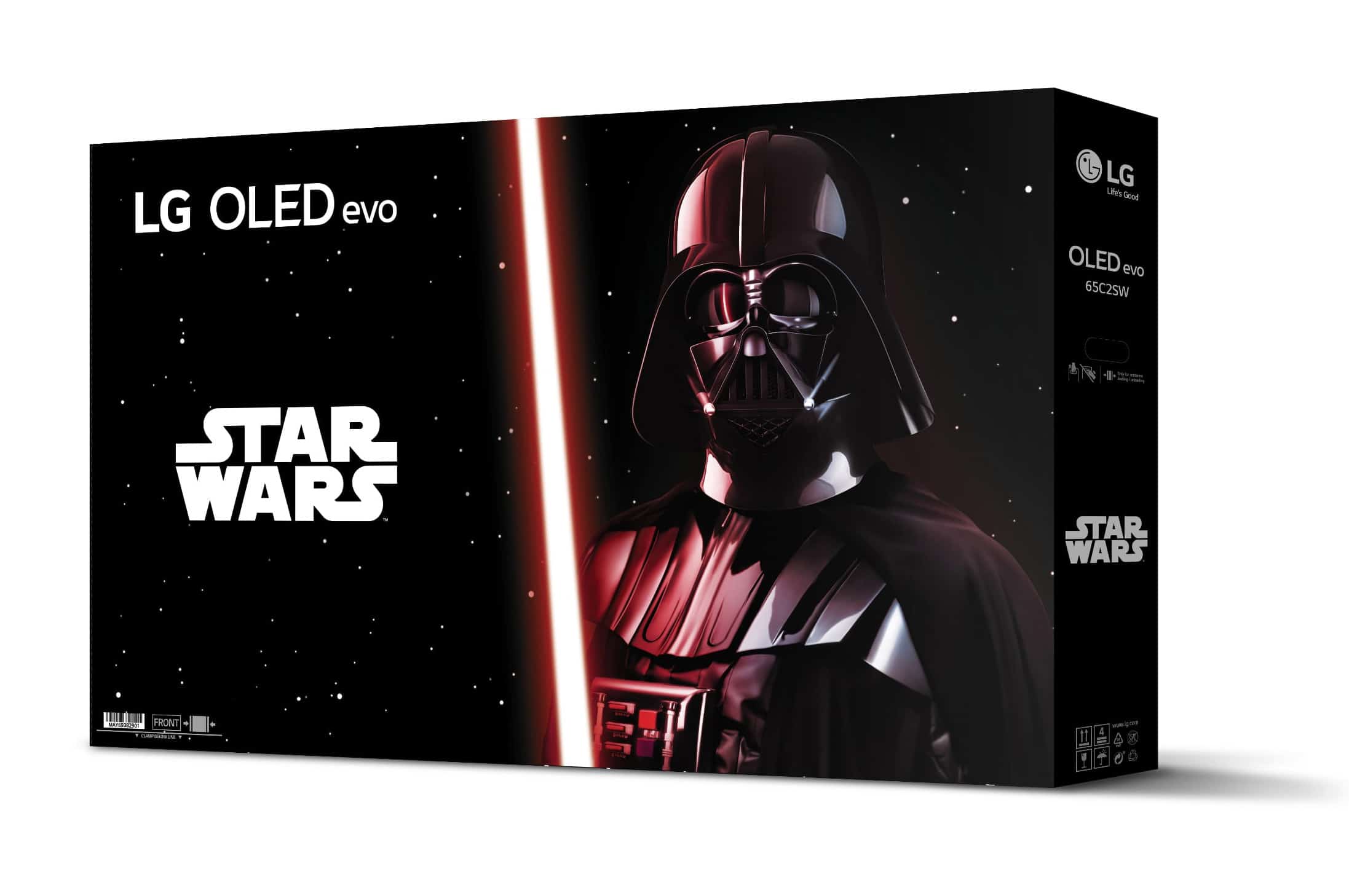 Doch was ist eigentlich so besonders an diesem TV? Also ihr bekommt auf jeden Fall schon einmal einen C2 OLED TV mit 65 Zoll und Evo-Panel. Bedeutet großartige Bildqualität für Filme, Serien, TV und Games. HDMI 2.1, 4K@120Hz mit VRR und Dolby Vision, Dolby Atmos-Unterstützung usw. Der TV sowie die Fernbedienung werden um Designelemente aus dem Star Wars Universum aufgewertet. So prangert unter anderem das Symbol des „Galaktischen Imperiums“ auf der Rückseite des OLED Fernsehers und die Fernbedienung wird um das offizielle Star Wars Logo aufgewertet. Auf der Verkaufsverpackung sehen wir keinen geringeren als Darth Vader mit seinem roten Lichtschwert!