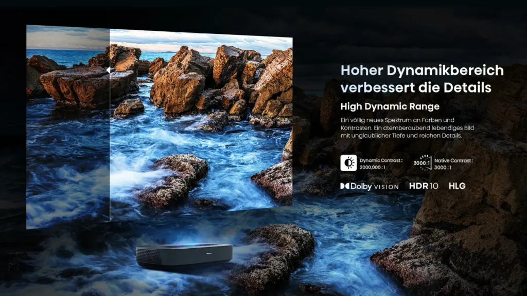 Bei Inhalten in HDR soll der Hisense PL1 Laser Cinema so richtig glänzen. Unterstützt wird neben den geläufigen Standards HLG und HDR10 auch das dynamische Format Dolby Vision. Um eine möglichst unverfälschte Bilddarstellung zu erhalten, steht dem Hisense PL1 Laser Cinema sogar der Filmmaker Mode zur Verfügung. Bei der visuellen Darstellung wäre auch noch der Game-Modus hervorzuheben. Dieser schaltet sich automatisch ein, wenn eine Spielekonsole (sofern diese ALLM unterstützt) mit dem 4K Beamer verbunden wird. Dieser soll den Input-Lag gegenüber der regulären Projektion für Filme und Serien deutlich reduzieren. Sollten die Werte in den Spezifikationen stimmen, dann liegt dieser bei unter 120ms, was nicht unbedingt einen guten Wert darstellen würde. Uns fehlt leider auch die Angabe zur Bildwiederholungsfrequenz. Jedoch würden in dieser Preisklasse auf 60Hz tippen.