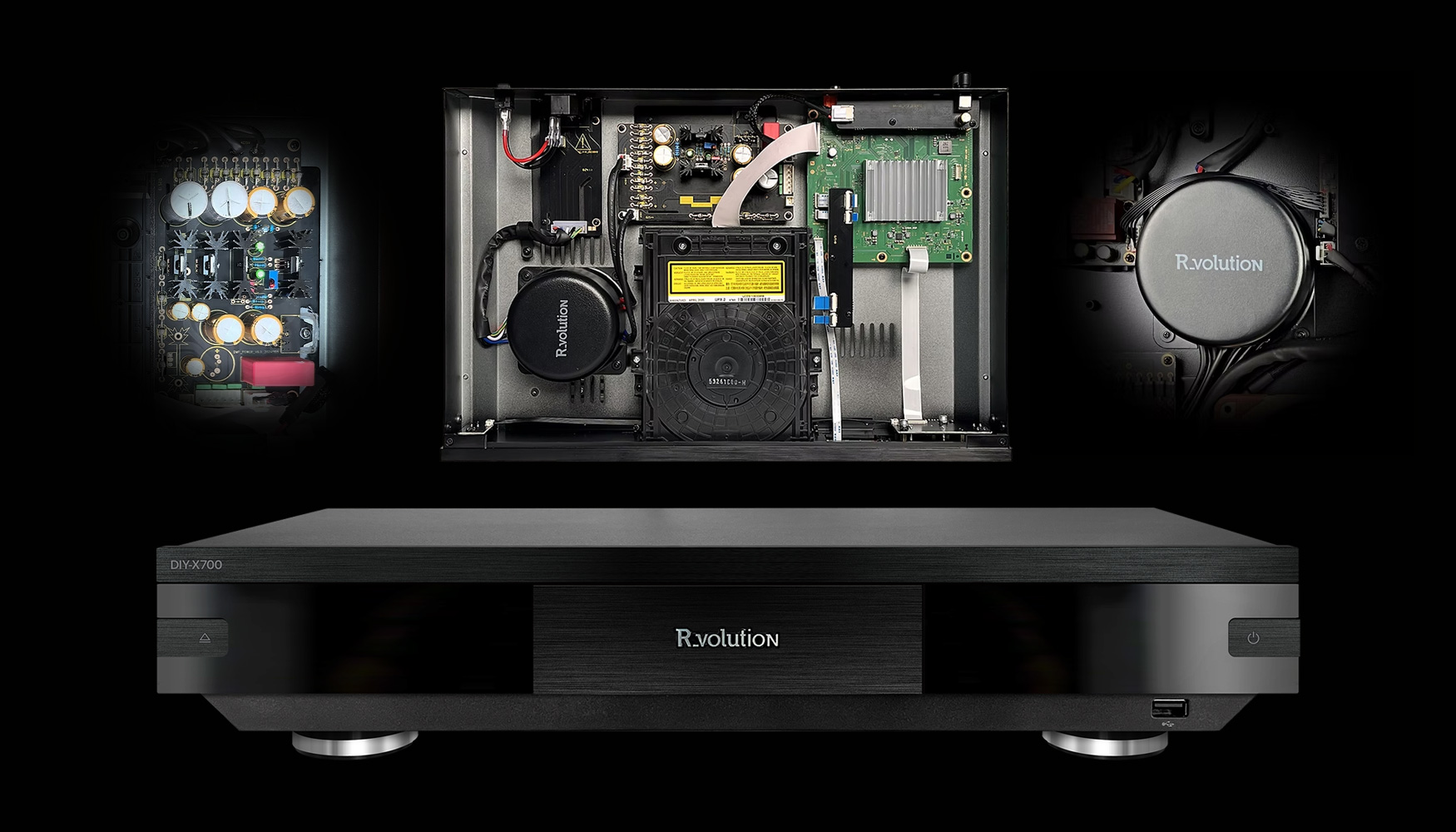 R_volution positioniert das DIY-X700 Upgrade-Kit als „True High-End“-Aufwertung. Ziel der bislang einmaligen Hardware-Optimierung ist es, bessere Schwarztöne, präzisere Farben, mehr Bildschärfe sowie einen dynamischeren und präziseren digitalen Mehrkanalton abzuliefern. Dabei greift das Upgrade-Kit nicht in die eigentliche Signalverarbeitung durch den Bild- und Audioprozessor ein, sondern liefert den verarbeitenden Komponenten lediglich eine saubere Stromversorgung als Basis.