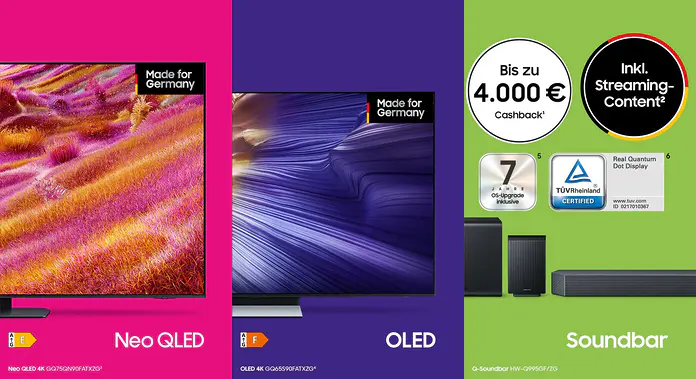 Ihr könnt die frische Cashback-Aktion auch mit „Made for Germany“ kombinieren. Im Rahmen dieser Aktion schenkt euch Samsung beim TV-Kauf ein umfassendes Streaming-Paket mit einigen zeitlich beschränkten Gratis-Zugängen zu beispielsweise RTL+, MagentaTV, WOW und mehr. „Made for Germany“ ist noch bis 31. Juli 2025 verfügbar.