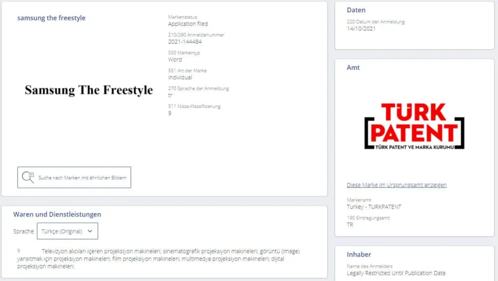 Samsung hat auf sich die Wortmarke „The Freestyle“ bei mehreren Patent- und Markenämtern für seinen neuen 4K UHD Projektor sichern lassen. Ankündigung zur CES 2022?