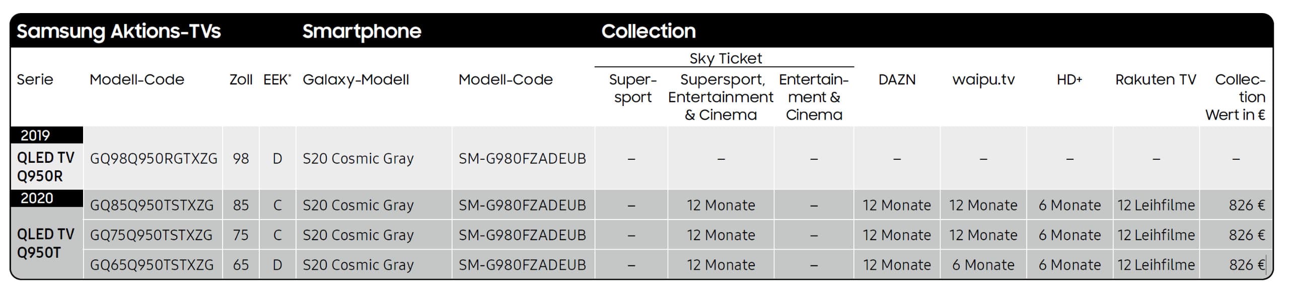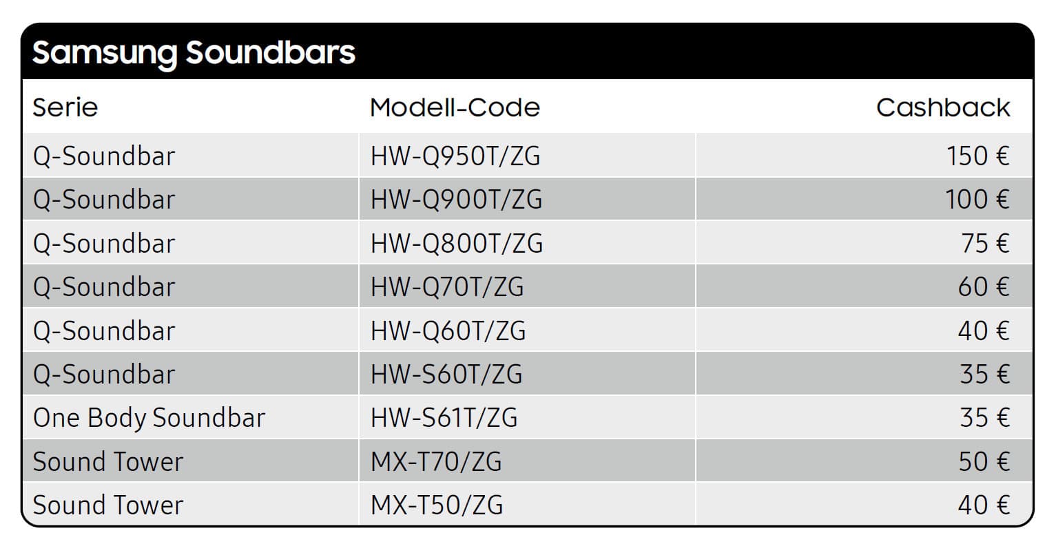 Samsung selbst schlüsselt die Teilnahmebedingungen der Aktion und die teilnehmenden TVs und Soundbars in diesem PDF für euch auf. Wichtig ist, dass nur TVs und Soundbars mit deutschen Modellnummern an der Aktion teilnehmen! Achtet also darauf nicht versehentlich einen Grauimport aus einem anderen EU-Land zu ergattern. Die Aktion wird mit Samsungs aktuell laufender Entertainment-Aktion übrigens kombiniert.