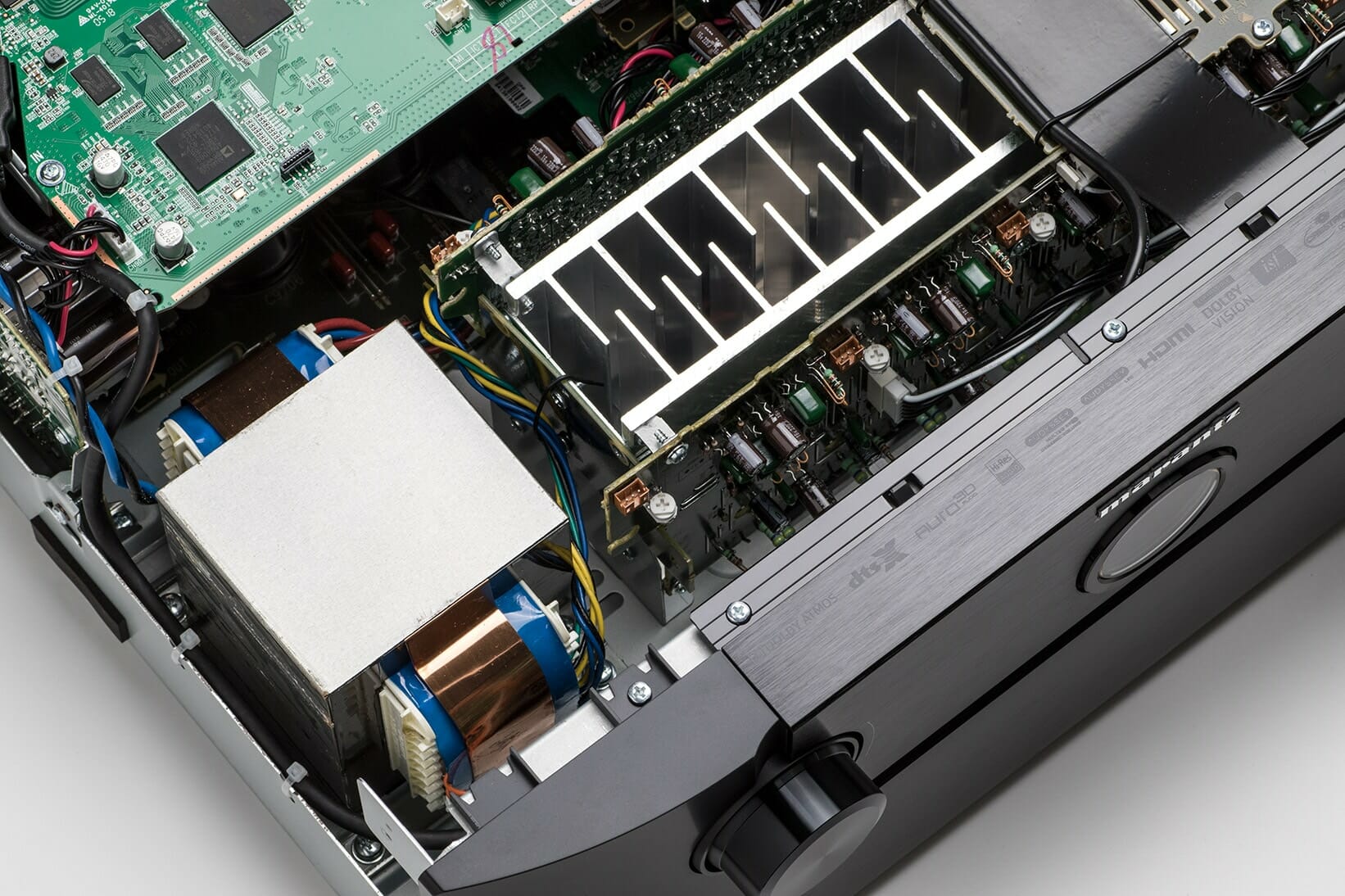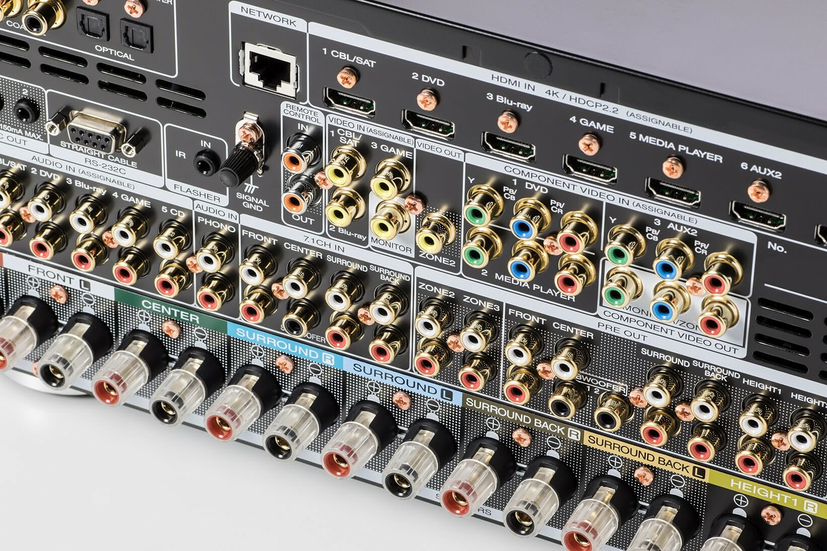 Acht HDMI-Eingänge (einer davon auf der Vorderseite) und drei HDMI-Ausgänge unterstützen allesamt das 4K UHD Videoformat mit 60p, 4:4:4 Farbauflösung, BT.2020 Farbraum und High Dynamic Range (HDR10, HLG, Dolby Vision). Marantz sichert die volle HDMI-Bandbreite von 18 Gbps zu. Über die HDMI-Ausgänge können unterschiedliche Zonen (Räume) mit Bild- und Tonsignalen versorgt werden.