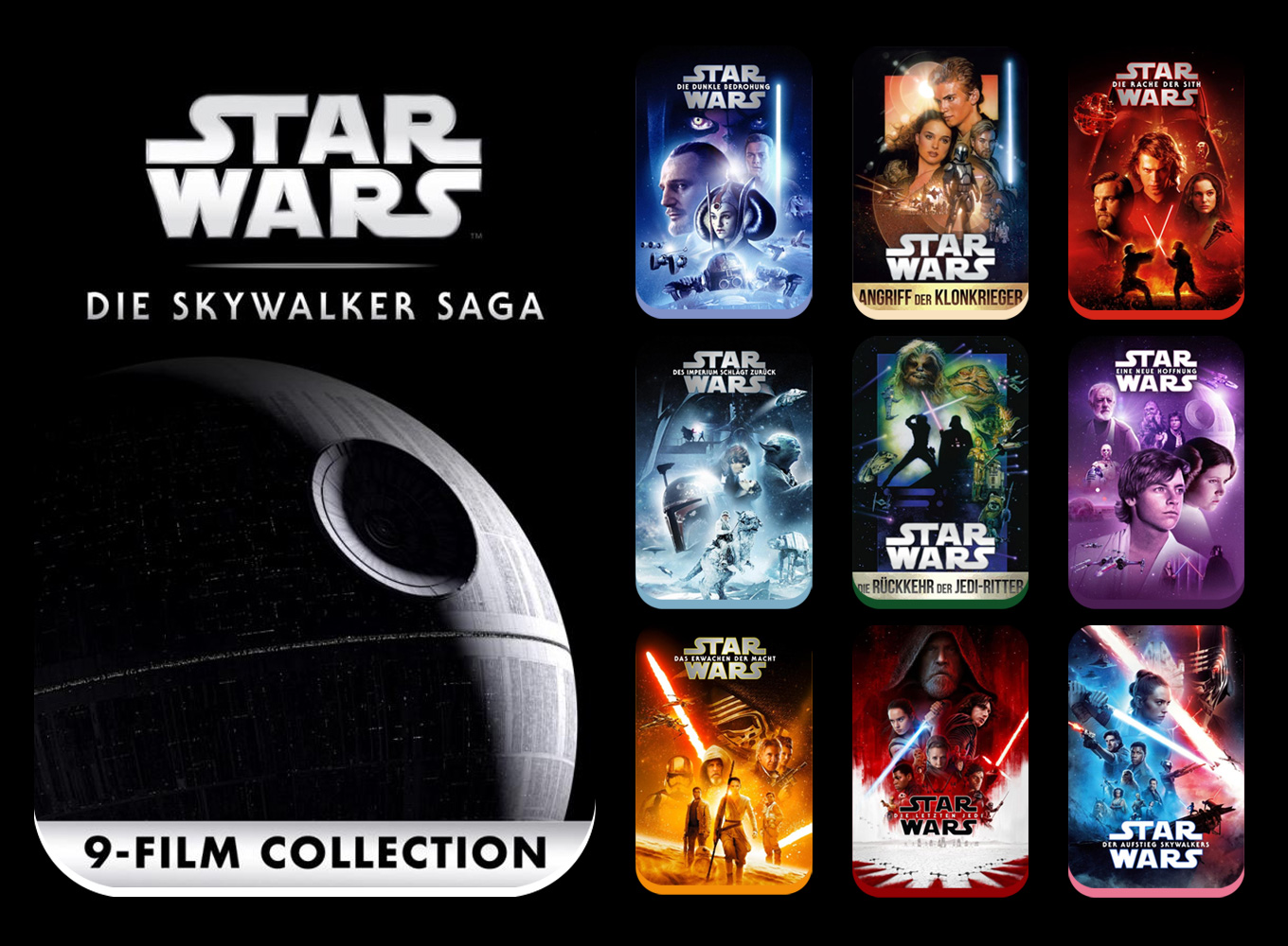 Mit der „Star Wars 1-9: Die Skywalker Saga“ bekommt ihr einen umfassenden Einblick in eine der spannendsten Geschichten der Filmgeschichte. Für nur 89,99 Euro erhaltet ihr über 20 Stunden beste Unterhaltung und seid danach absolut auf dem Laufenden, was das Thema „Star Wars“ angeht.