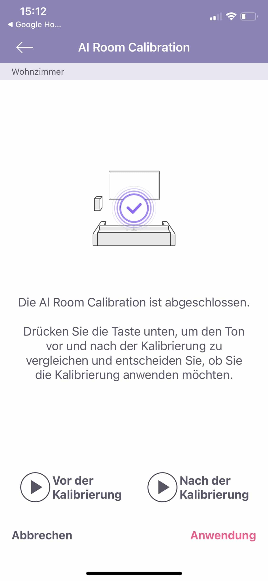 Hat man die Soundbar erfolgreich mit seinem Google Konto verknüpft und so ins Heimnetz eingebunden, so kann man die kostenlose LG WiFi Speaker-App nutzen. Diese ermöglicht das Streamen von Musik direkt vom Smartphone, Tablet oder einem NAS-Netzwerkspeicher. Über das WLAN-Netz und Google Chromecast Technologie erfolgt das Streamen sogar Raumübergreifend und machen aus der LG DSN8YG ein echtes Multiroom Talent. Einziges Manko ist die fehlende Unterstützung für Apple AirPlay 2, die wir uns in dieser Preisklasse gewünscht hätten. In der App kann man zusätzlich umfangreiche System- und Klangeinstellungen vornehmen und mittels AI Room Calibration erstmals die Raumakustik analysieren umso eine individuelle Klangoptimierung des Klangriegels vorzunehmen. Die vollautomatische Einmessung sorgt für eine perfekte Anpassung an die akustischen Gegebenheiten im Hörraum. Nach der Einmessung hat man die Möglichkeit, einen vorher nachher Test durchführen, der durchaus hörbar ist.