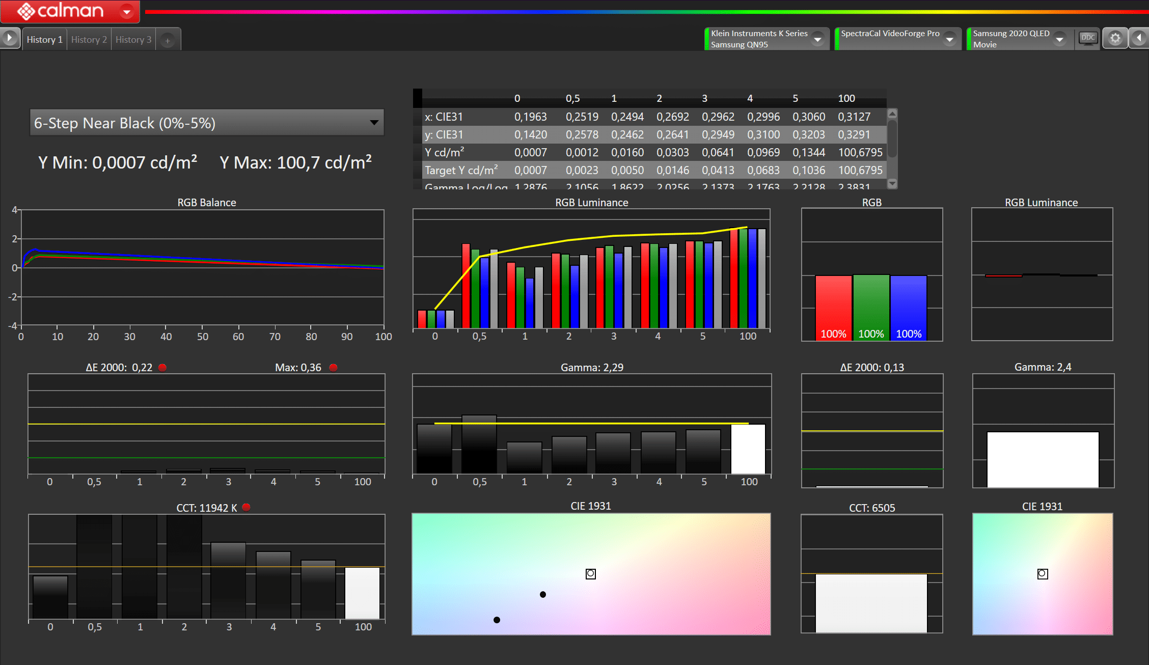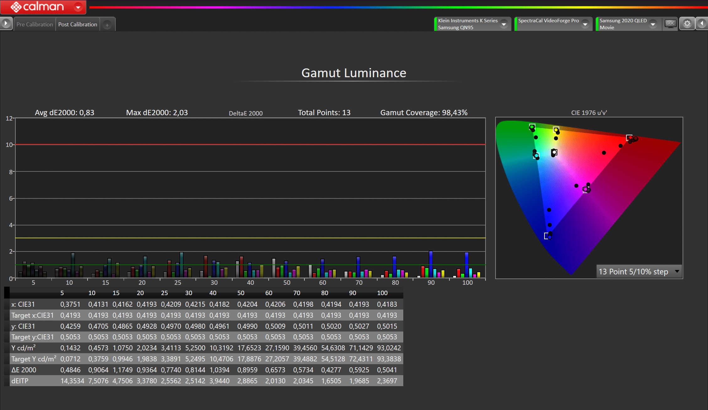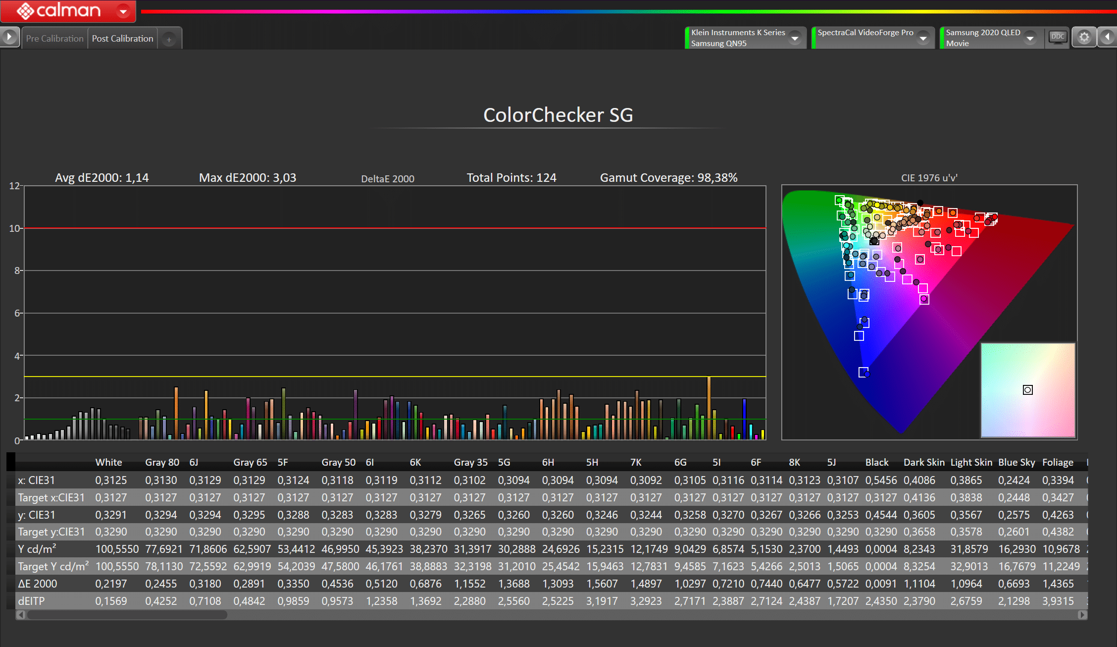 Nach der Kalibrierung des SDR Bildmodus zeigt sich die RGB Balance neutral und schön ausgeglichen. Der vorherige Überschuss an Rot und das Defizit an Blau konnte mühelos behoben werden. Auch der Gamma Verlauf konnte deutlich verbessert werden und zeigt sich nach unseren Anpassungen nun Mustergültig wobei wir an der Stelle schon etwas mehr in die Trickkiste greifen mussten, da die üblichen Regler zur Gamma Korrektur nicht ausgereicht haben. Mit der Hilfe der Schwarzpegel Anpassung war es uns möglich den Gamma Peak bei 5-10 IRE auszugleichen. Der Weißpunkt konnte ebenfalls auf D65 angepasst werden, ebenso wie die zuvor noch schwache Hintergrundbeleuchtung. Auch alle Primär- sowie Sekundärfarben treffen nun deutlich besser die Zielkoordinaten innerhalb des CIE Charts. Der vorherige Drift von Magenta ist ebenfalls nicht mehr vorhanden. Die Post-Calibration Messung ist dank einiger Anpassungen und Korrekturen als sehr gut zu bezeichnen. Dennoch ist es uns ein Rätsel, wieso Samsung hier nicht etwas mehr Arbeit in die Werksabstimmung der TV-Geräte steckt denn schließlich sind die Geräte nicht gerade günstig und Samsung möchte sich mit den Modellen im High-End-Segment platzieren. Unser Sample gehört aufgrund einer Serienstreuung vielleicht zu einem der schlechteren Exemplare.