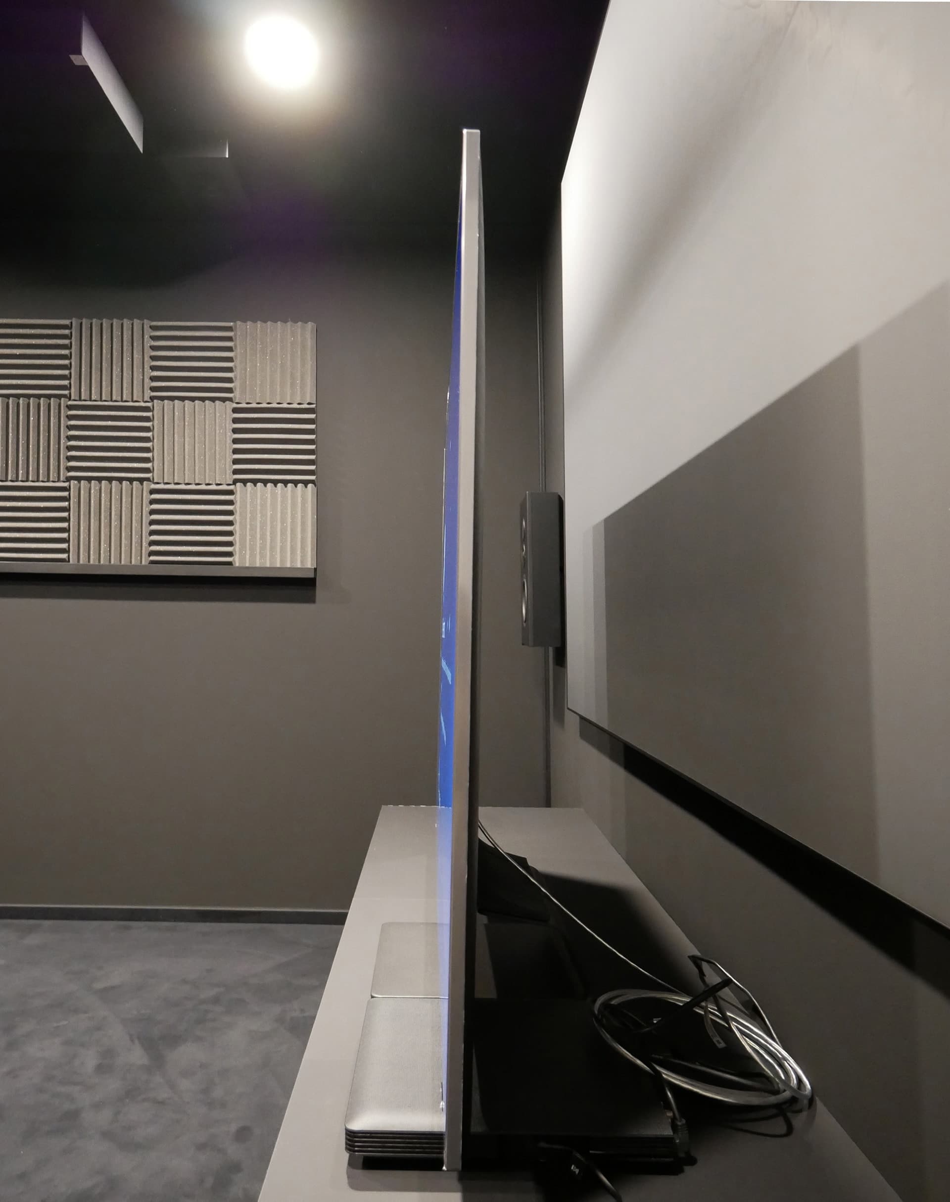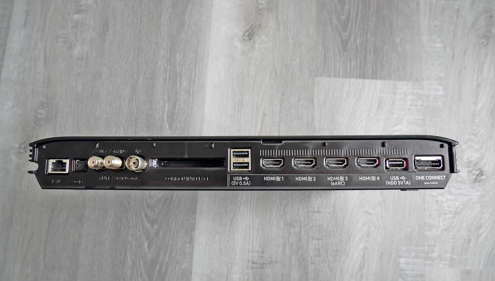 Nicht nur die verbaute Elektronik ist flacher und kleiner geworden, sondern auch die neue OneConnect-Box. Diese ist im Vergleich zum Vorjahr nicht nur deutlich schlanker, sondern auch eleganter geworden. Das grundlegende Konzept dahinter bleibt jedoch gleich so wird auch die neue Slim One-Connect mit nur einem Kabel mit dem TV-Gerät verbunden. Was sich ebenfalls geändert hat, ist die Kabellänge. Zwar wurde diese von fünf auf drei Meter reduziert, dafür ist das Kabel nun deutlich dicker als zuvor und wirkt dadurch insgesamt wertiger. Es ist sogar möglich, die Box mithilfe von wenigen Schrauben aufzuhängen so fern dies gewünscht ist. Neben insgesamt vier HDMI 2.1 Eingängen, die alle bis zu 40 Gbps unterstützen, finden auch ein Doppeltuner sowie weitere Anschlüsse in dem äußerst kompakten Gehäuse Platz. Lediglich der seitlich platzierte Stromstecker trübt den ansonsten sehr gelungen Facelift. Neben den bekannten Funkstandards sind WiFi 5 und Bluetooth 4.2 ebenfalls mit an Board.