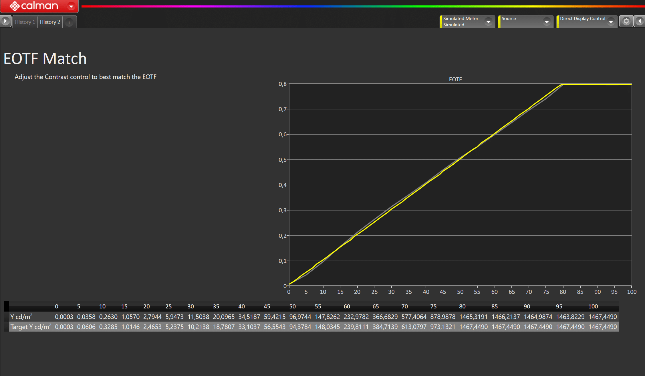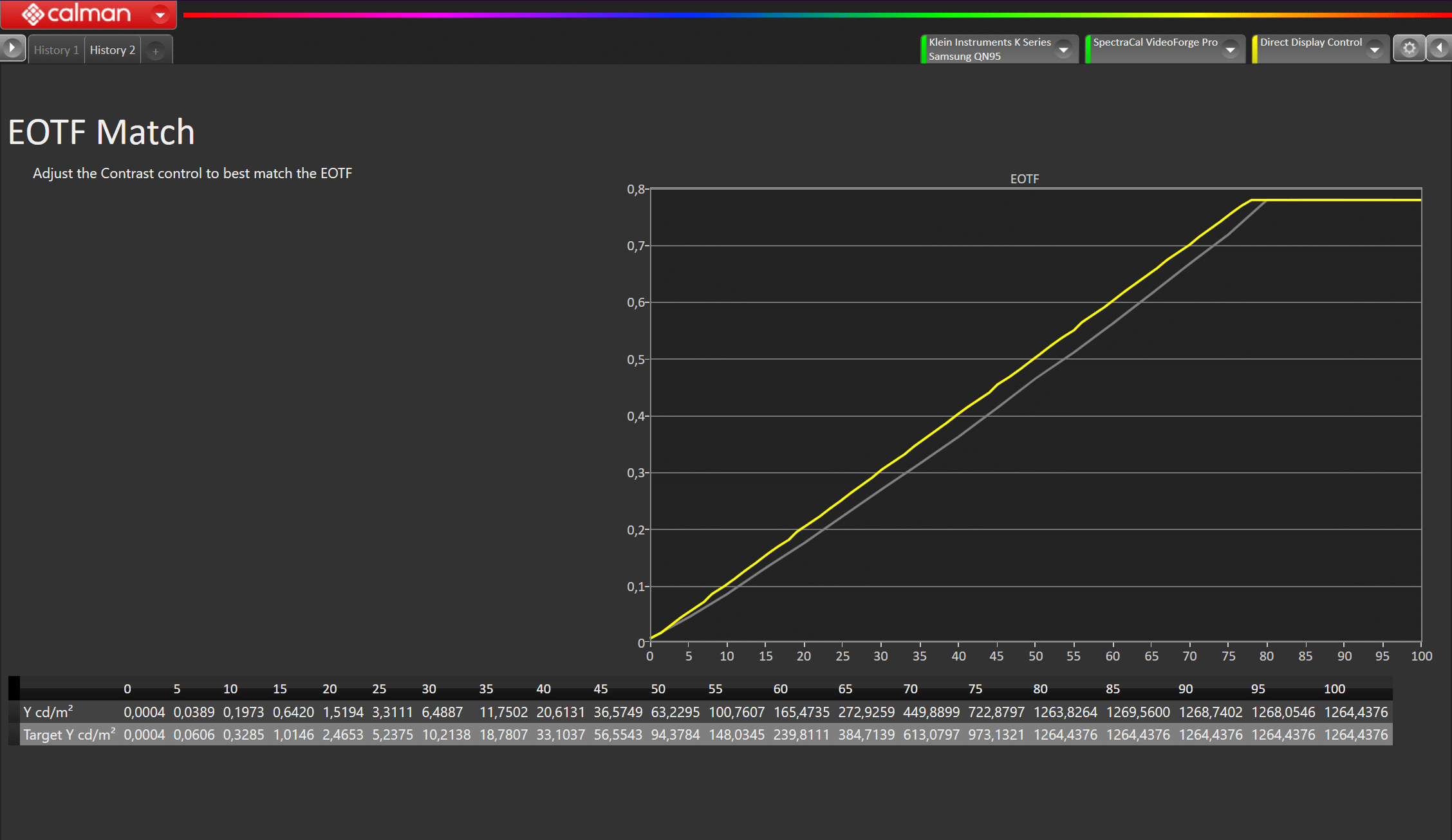 Für unsere HDR10 Bildmessung haben wir erneut den FILMMAKER MODE als Grundlage gewählt. Die Ergebnisse sind leider nur als mittelmäßig zu bezeichnen und reihen sich qualitativ zu denen für SDR-Bildinhalte ein. Auch hier zeigt die RGB Balance ab dem mittleren Helligkeitsbereich erneut einen zu hohen Anteil der Primärfarbe Rot und ein deutliches Blau-Defizit. Diese Dysbalance konnten wir jedoch bereits durch eine simple Anpassung des Weißpunktes korrigieren, wie auf dem „Post Calibration“ Screenshot zu sehen ist. Was uns wirklich ins Staunen versetzt hat, ist das werkseitige EOTF-Tracking des QN95A. Anders als für den Hersteller aus Korea üblich, ist dieses nämlich nicht deutlich zu Hell abgestimmt, sondern tatsächlich zu dunkel. Für Details nahe Schwarz ist für die Wiedergabe von HDR10 Inhalten insbesondere der Bereich bis 100 Nits ausschlaggebend. Genau in diesem Bereich ist der Samsung jedoch zu dunkel abgestimmt. Auch hier kann man mit den TV internen Einstellungsreglern jedoch entgegenwirken, sodass man einen mustergültigen EOTF-Verlauf erhält.