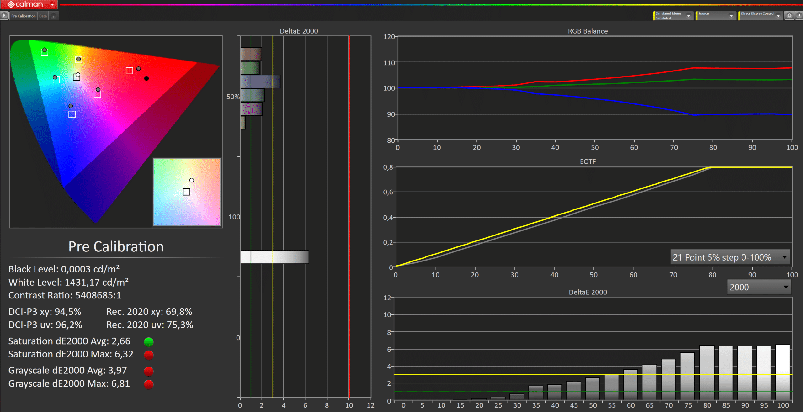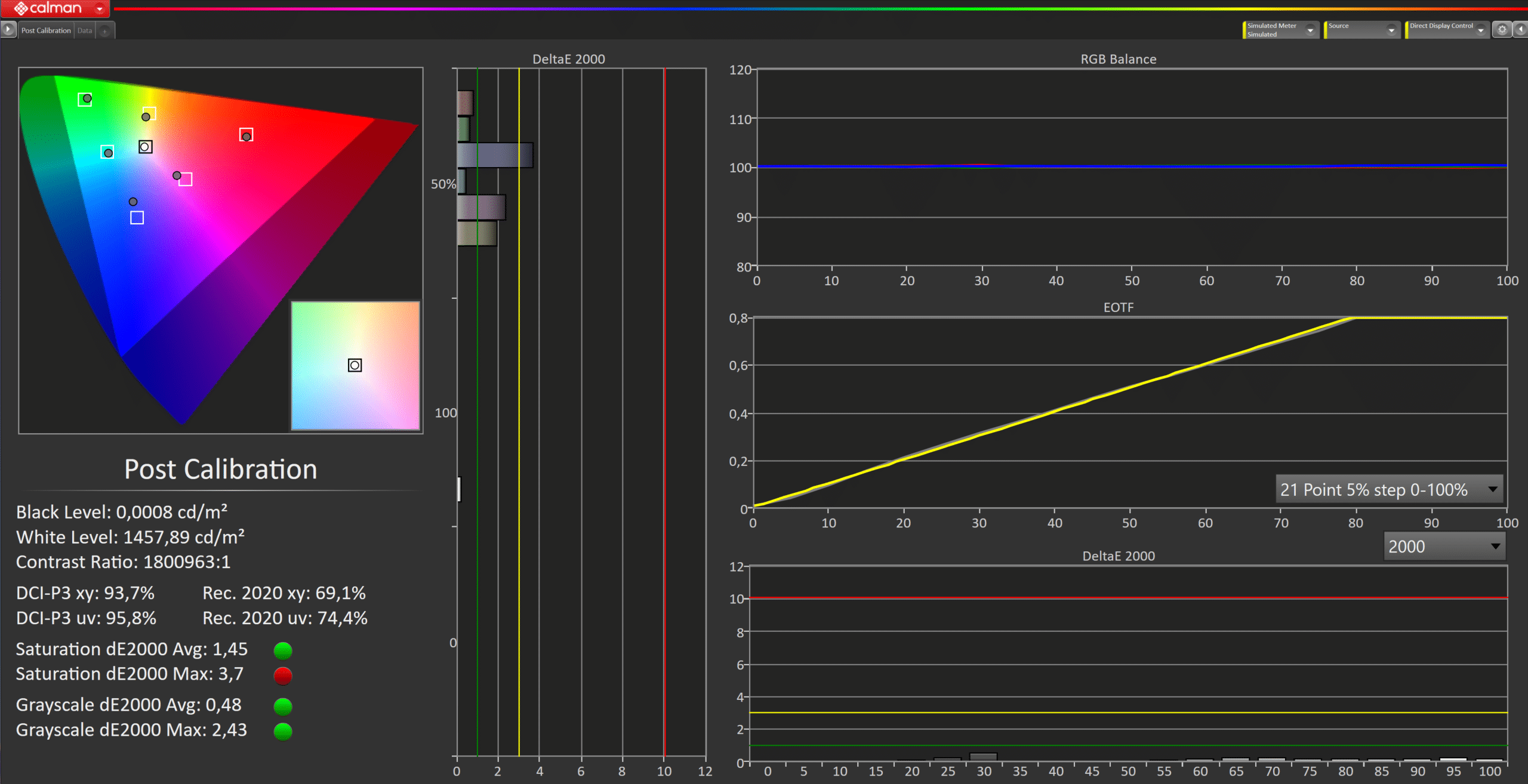 Die ColorMatch HDR Farbpalette ergibt mit einem durchschnittlichen Fehlerquotienten dE von 2.3 ein solides Ergebnis ab. Der höchste Fehler liegt bei 4.3 und liegt somit nur knapp über dem Richtwert von dE 3.0. Die Maximalhelligkeit unseres Test Samples lag bei ~1.460 Nits und bietet somit beste Voraussetzungen für einen erstaunlichen HDR Effekt. Die Farbraumabdeckung für DCI-P3 liegt bei 96% während der BT.2020 Farbraum mit 74% abgedeckt wird.