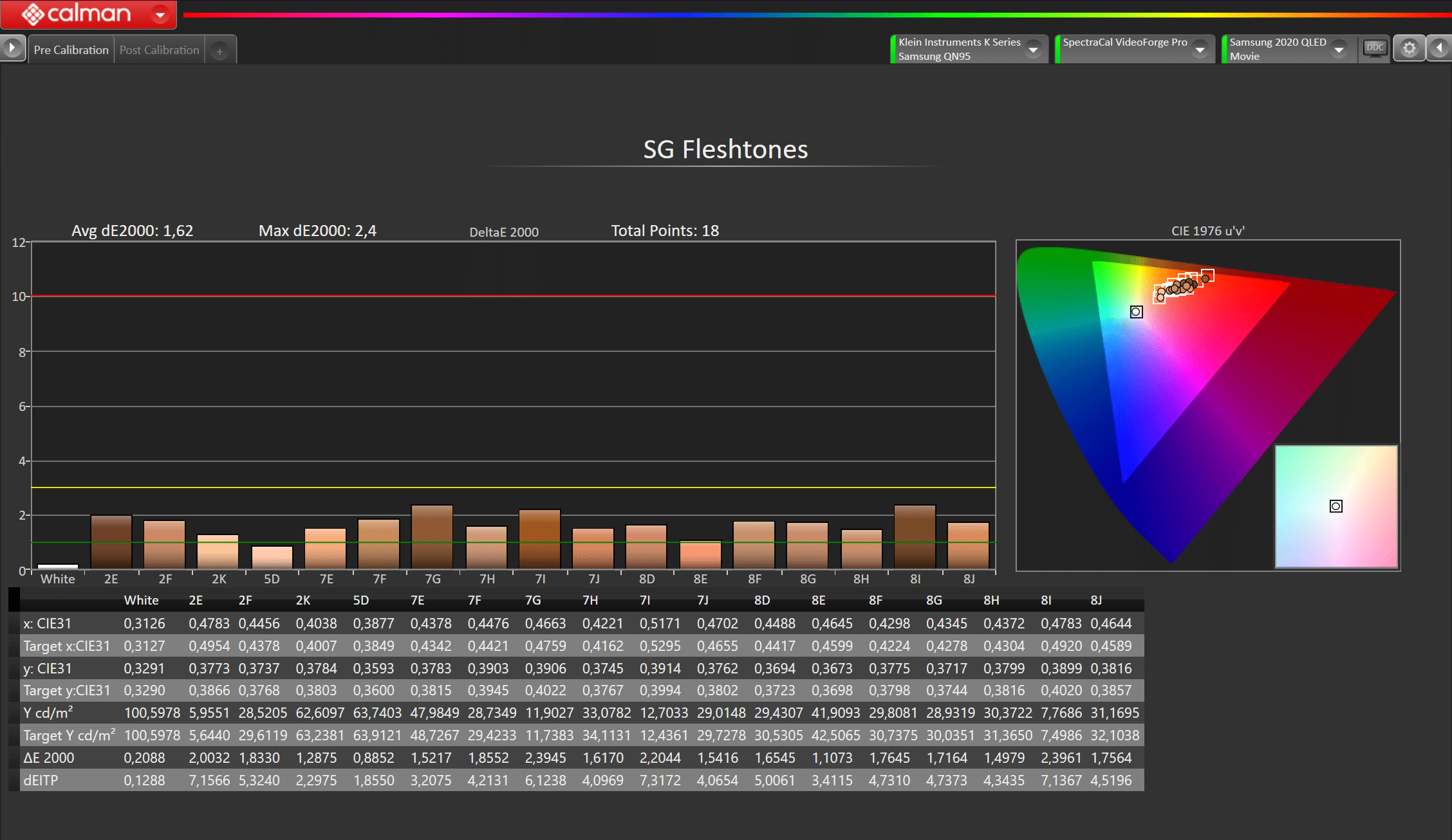 Auch wenn der Samsung QN95A nicht die Möglichkeit einer 3D LUT Kalibrierung bietet, wolltet wir überprüfen, wie sich das Gerät im Härtetest abseits der bekannten Messcharts schlägt. Hierfür haben wir wie schon in unserer Review zu dem LG G1 ein Custom Patchset das aus 1.000 Punkte besteht, vermessen und das Ergebnis daraus ist in der nachfolgenden Darstellung zu sehen. Das Resultat ist unter Berücksichtigung mangelnder 3D LUT Kompatibilität im oberen Mittelfeld anzusiedeln. Wie man gut sehen kann, liegen 141 der insgesamt 1.000 Messpunkte über einem Fehlerquotient dE von 2.3. Bleibt abzuwarten bzw. eher zu hoffen, dass auch Samsung eine 3D LUT Option in Kombination mit der Calman Software in Zukunft anbieten wird. Hersteller wie LG als auch Panasonic sind hier bereits seit 2018 als Vorreiter auf dem Gebiet der 3D LUT Kalibrierung unterwegs, da diese im Vergleich zu einer manuellen Kalibrierung das höchste Maß an Genauigkeit als auch Qualität bietet.