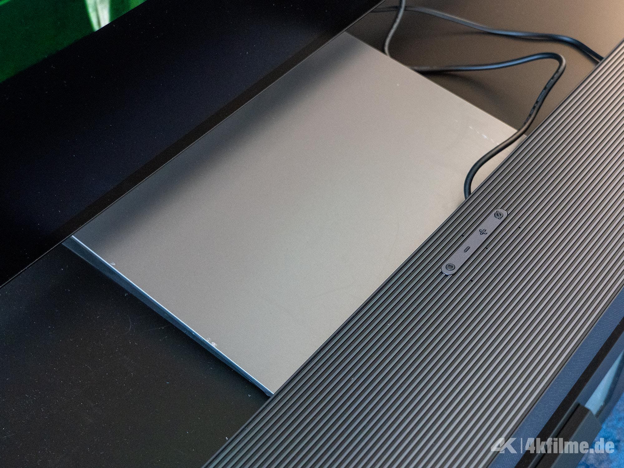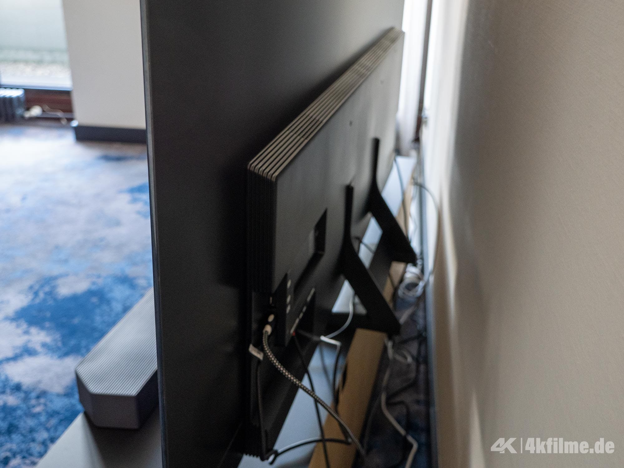 Auf der Rückseite des OLED‑TVs im unteren Bereich kann der S90H seine schlanke Linie von 4 mm nicht mehr ganz halten. Irgendwo muss die ganze Technik auch hin. Neben dem Bildprozessor und den Anschlüssen beherbergt der Aufbau auch zusätzliche Lautsprecher, unter anderem, um die Höhenkanäle von Dolby Atmos besser darstellen zu können. Insgesamt wirkt der S90H sauber verarbeitet und funktional konzipiert und dürfte auch bei einer Wandmontage so einiges hermachen. Spaltmaße oder ein verzogenes/verbogenes Display konnten wir nicht erkennen.