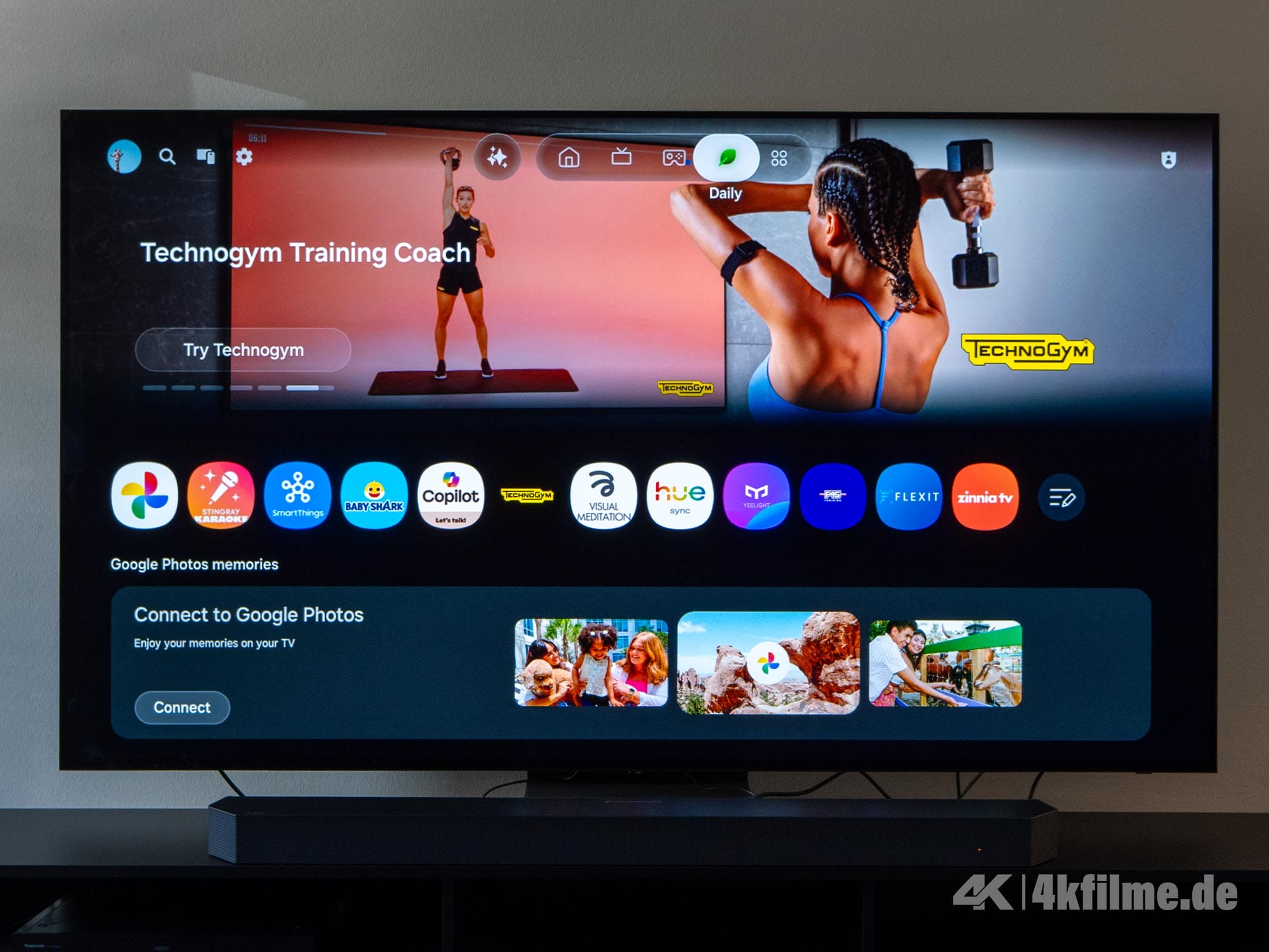 Das Home-Menü des Samsung S90H mit Tizen OS eröffnet sich uns als perfektes Sprungbrett, um in die jeweiligen Bereiche abzutauchen. Egal, ob man die zuletzt aufgerufene Signalquelle, eine neue App, ein Videospiel oder ein Komfort-Feature aufrufen möchte – mit Tizen OS ist man flott und intuitiv unterwegs. Dabei achtet Samsung darauf, die Features und Apps in die korrekten Tabs zu packen, damit der eigentliche Homescreen nicht zu überfüllt wirkt. Auf der Hauptseite oben links finden wir die Nutzerverwaltung, die Suche, Screen-Mirroring und die Einstellungen. Daneben die Zugänge zu Live TV (Internet TV), dem Gaming-Hub, einem Daily-Tab der einem täglich Inspiration für Spaß, Selbstentwicklung und Sport bietet, und zuletzt den Zugang zu allen verfügbaren Apps. Dazwischen haben wir noch eine Funktionstaste für den AI-Assistenten, der auch über eine entsprechende Taste auf der Fernbedienung abgerufen werden kann.