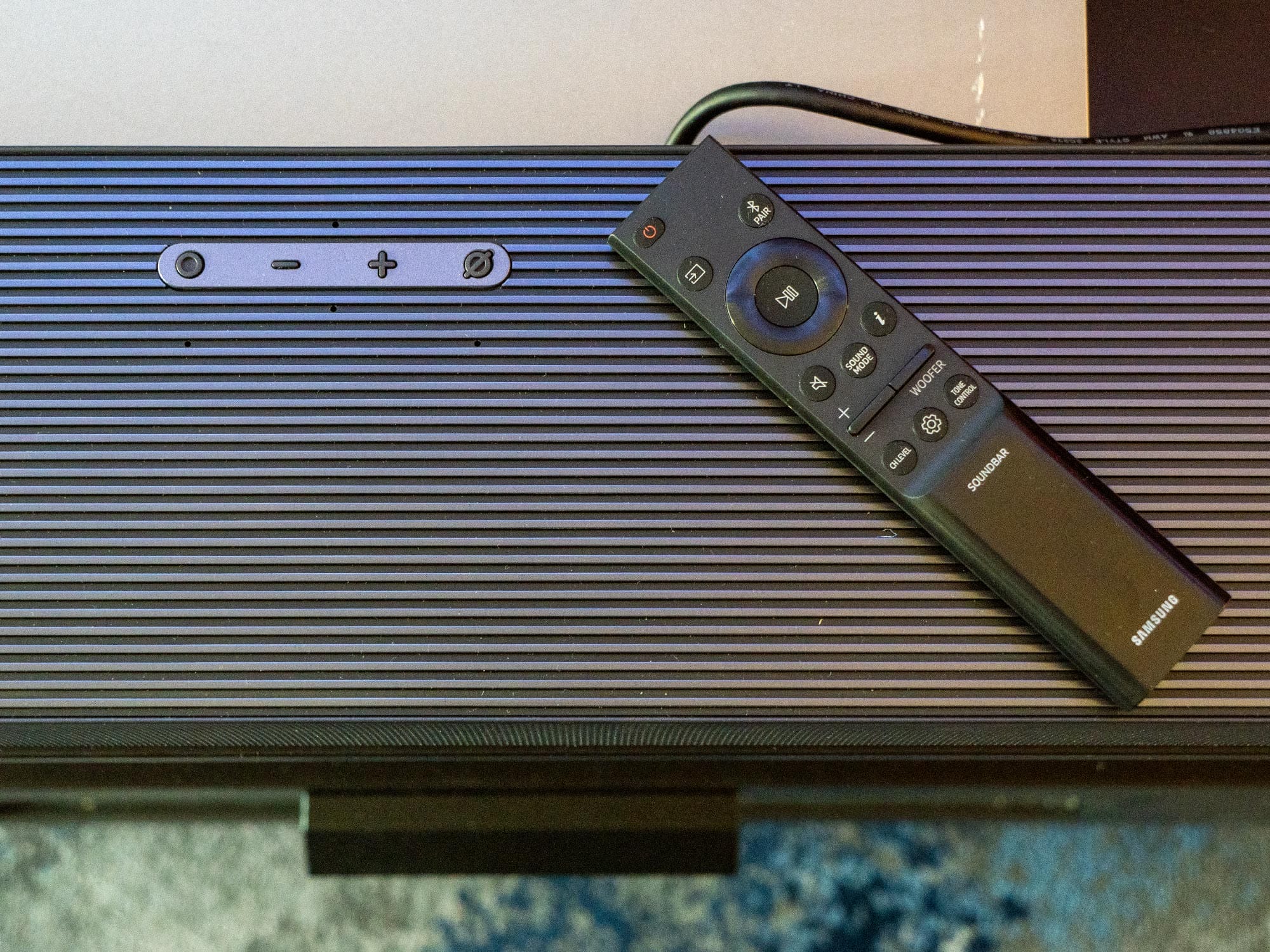 Integrierter TV-Sound ist schön und gut, möchte man die Audioqualität auf das gleiche Niveau wie die visuelle Qualität des Samsung S90H heben, ist eine Soundbar-Lösung (bevorzugt von Samsung) einfach Pflicht. Der Wechsel zwischen TV-Sound und der HW-Q995GH 11.1.4-Kanal-Soundbar offenbart, wie viel Potenzial man verschenkt, sollte man nur auf die integrierte Soundanlage des Fernsehers zugreifen. Noch besser klingen TV + Soundbar jedoch im Verbund über das Q-Symphony-Feature, welches die Klangwiedergabe der beiden Komponenten aufeinander abstimmt. Zudem lässt sich die Soundbar auch drahtlos mit dem Samsung S90H verbinden und behält dabei die Fähigkeit, Dolby Atmos 3D-Soundformate wiederzugeben. Und mit den Rear-Lautsprechern schafft es das System, eine hervorragende Surround-Ebene zu schaffen und auch die „akustische Glocke“ mit den Höhenkanälen für Dolby Atmos besser zu schließen.