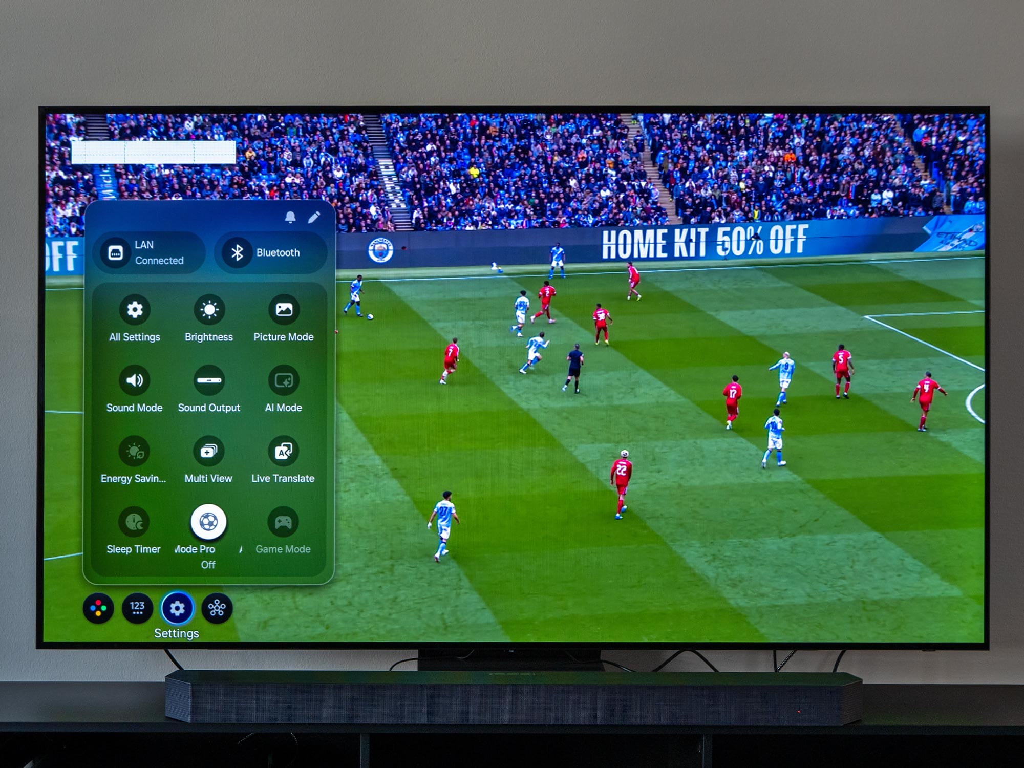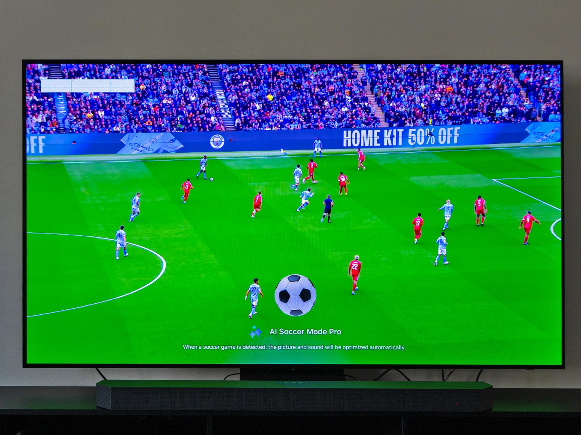 Wir können uns gut vorstellen, dass die Mitarbeiter von Samsung nicht wirklich Lust haben, dieses Feature auch nur anzusprechen. Die Führungsriege wird den neuen „AI Soccer Mode Pro“, sprich den neuen KI-unterstützten Fußball-Bildmodus Pro, dagegen für eine ganz tolle Idee halten. Wir können uns noch schwach an die Zeiten erinnern, als ein Fußball-Modus bei den meisten TV-Geräten von Samsung enthalten war, welcher die Bilddarstellung jedoch ins Lächerliche zog. Überstrahlende Farben, ein neongrüner Rasen und so grelle Trikots, dass sich zum größten Teil keine Details mehr auf dem Stoff ausmachen ließen. Und genau dieser Bildmodus ist wieder zurück – dieses Mal eben mit künstlicher Intelligenz.