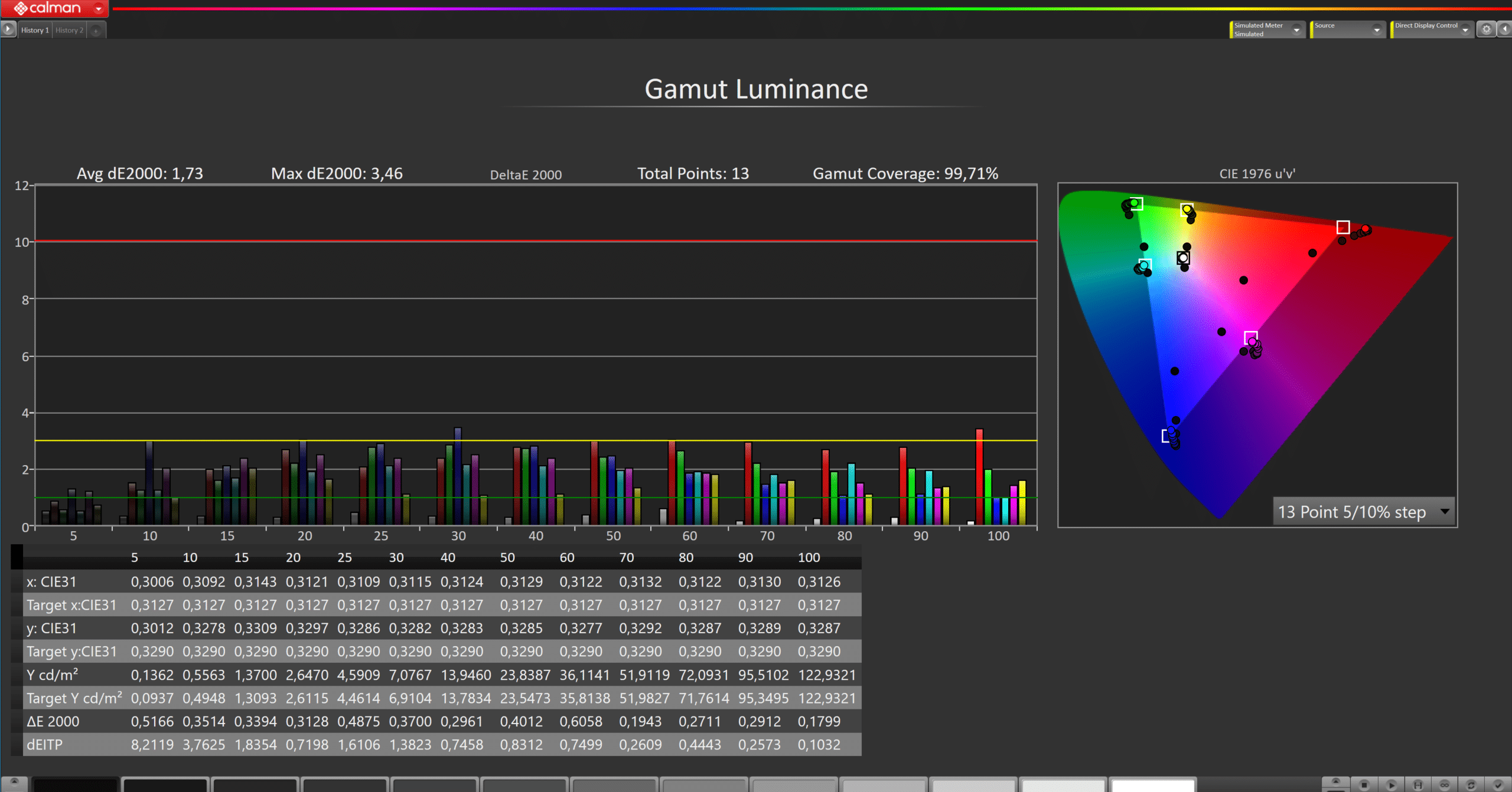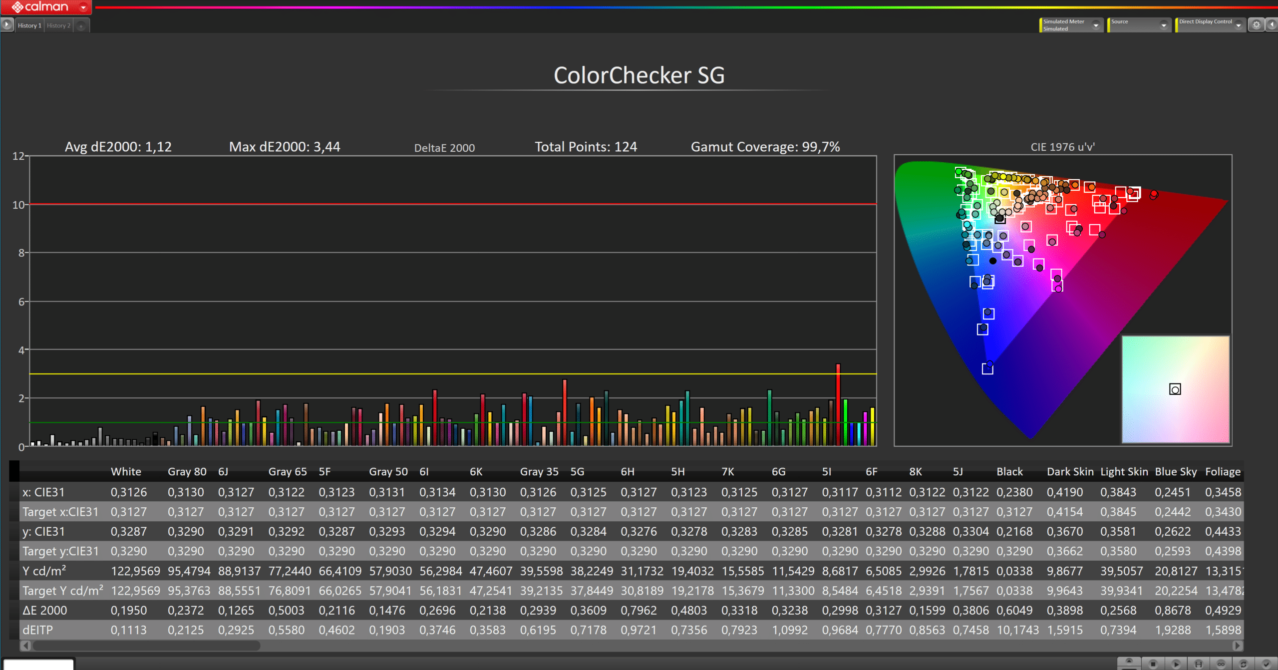 Wie alle anderen Geräte zuvor musste auch der XH90 gegen die ColorChecker SG Messpalette antreten. Wir nutzen unter anderem diese 123 verschiedenen Messbilder, da diese Farbmuster besonders häufig in Film und Fernsehen zum Einsatz kommen. Das Ergebnis mit einem durchschnittlichen dE von 1,12 beweist eindrucksvoll, dass auch ohne CMS Anpassung alle wichtigen Farbsättigungen in Studioqualität dargestellt werden. Der Ausreißer mit einem dE von 3,44 ist der Farbe Rot geschuldet. Besonders Hauttöne stellt der XH90 mustergültig dar und sorgt somit für ein natürliches Bild. Eines der wenigen Kritikpunkte, die wir für unser Testsample ausmachen können, ist die gemessene Farbluminanz. Diese ist über alle Helligkeitsbereiche hinweg zu hoch, was unter anderem zu dem beschriebenen Rot Problem innerhalb des CIE Charts führt. Insgesamt jedoch ist auch dieses Ergebnis innerhalb der Norm und keineswegs als schlecht zu bezeichnen – eben meckern auf hohem Niveau.