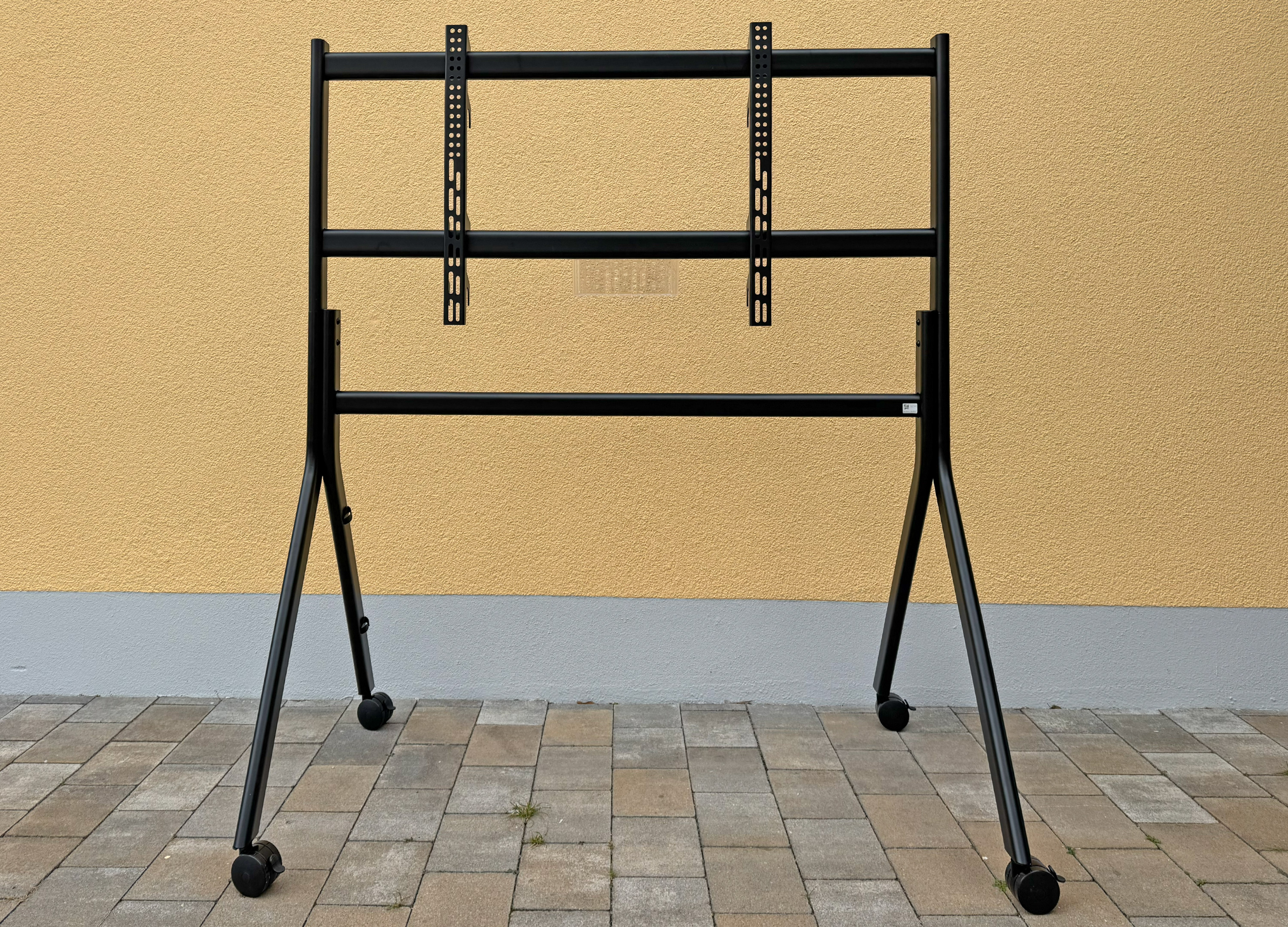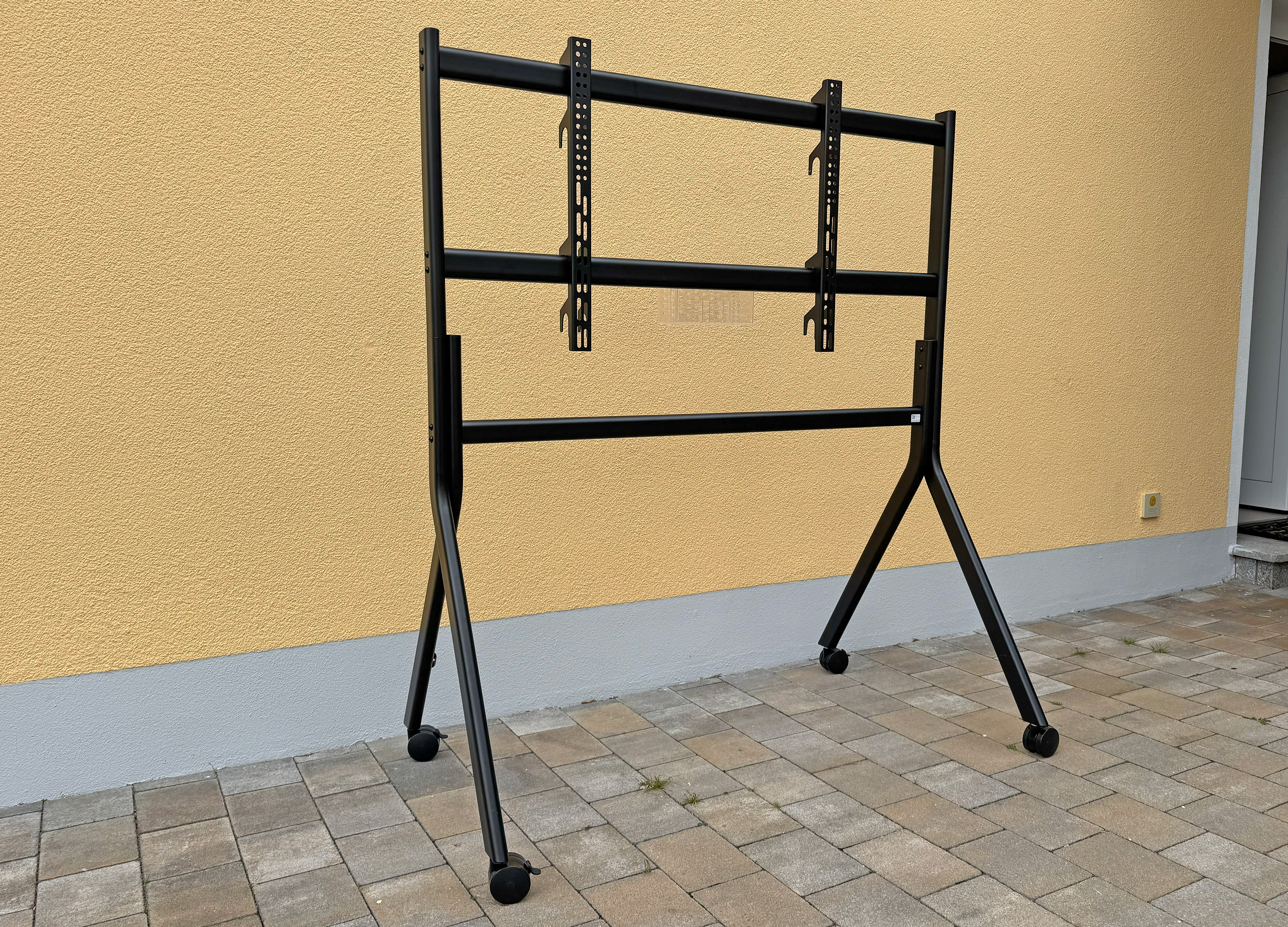 Das Gespann lässt sich dank der Rollen sehr einfach bewegen, obwohl TV und Trolley zusammen um die 45 kg wiegen dürften. Der TV-Trolley ist übrigens für ein maximales Gewicht von bis zu 60 kg ausgelegt. Outdoor-Fernseher mit bis zu 75 Zoll stehen damit stabil und sicher.