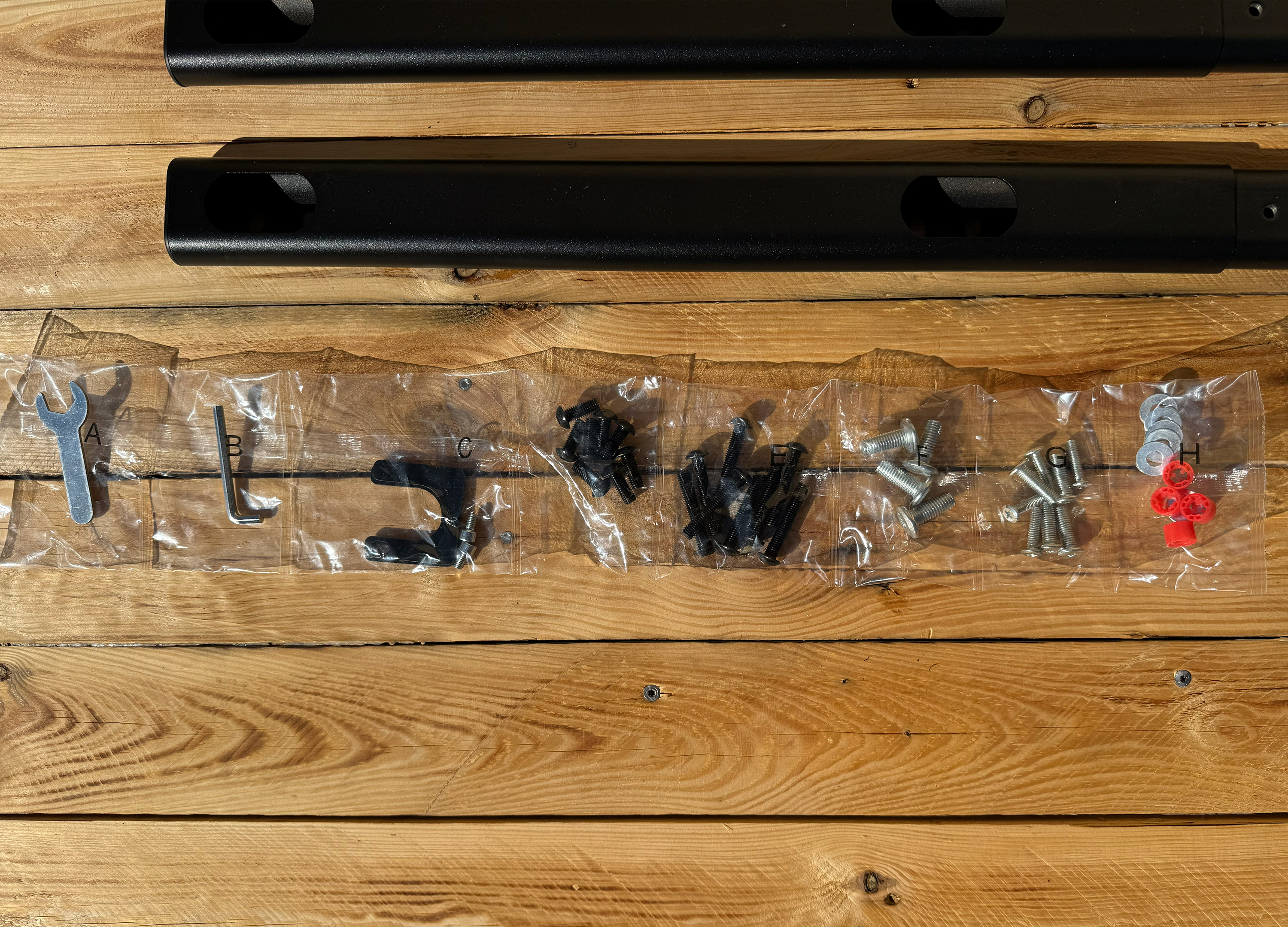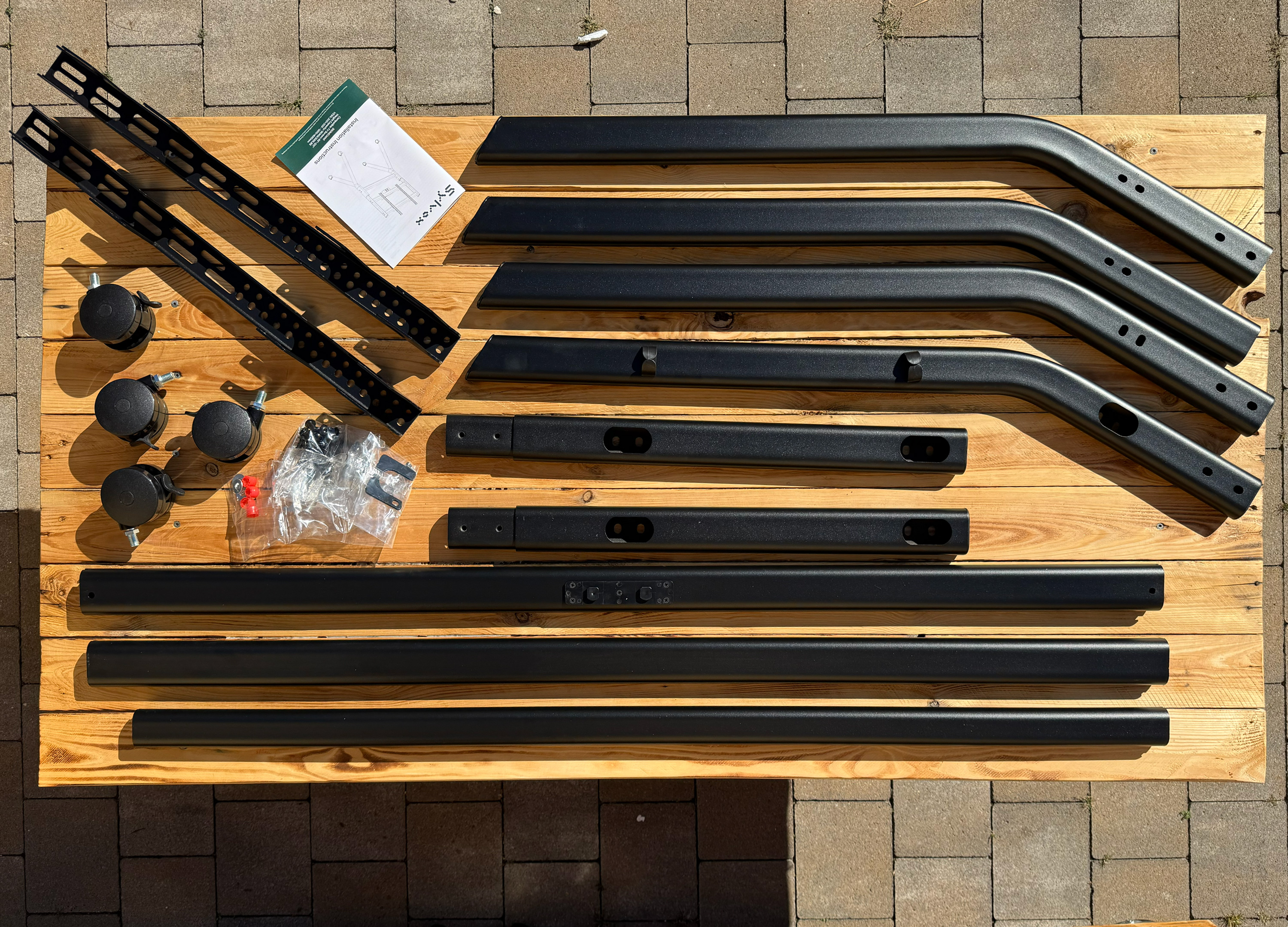 Der Aufbau des Sylvox OT55 4K-Outdoor-Fernsehers sowie des stabilen TV-Trolleys S50MCMA0 (optional) sollte auf jeden Fall mit zwei Personen erfolgen. Obwohl Trolley und Fernseher extrem stabil gefertigt wurden, ist es definitiv zu empfehlen, den Fernseher mit 25 kg Gewicht zu zweit aufzubauen. Im Lieferumfang des Fernsehers sind eigentlich nur der TV selbst, ein Kaltgerätestecker, eine wasserdichte Fernbedienung, eine Bedienungsanleitung, sowie Schrauben samt Abstandshalter enthalten. Die TV-Halterung im Trolley-Format wartet dagegen mit einer Vielzahl von Bauteilen und Einzelteilen (Schrauben etc.) auf.