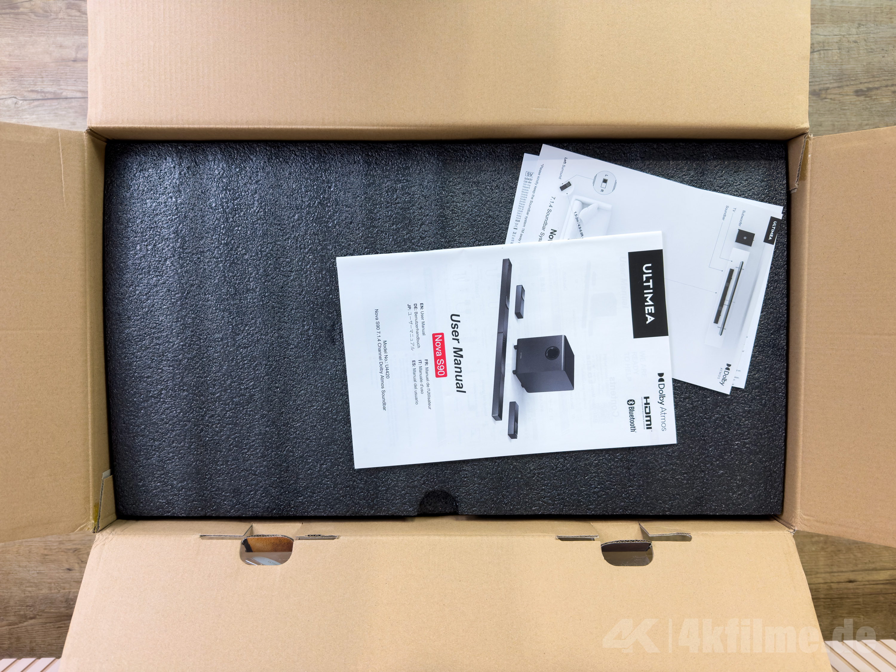 Wir müssen auch noch ein Wort zum Design der Nova-Serie verlieren. Wer möchte, darf sich mittels unserer Bilder auch gerne eine eigene Meinung bilden. Für den Preis und die Ausstattung ist die Ultimea Nova S90 doch recht schick. Über Geschmack lässt sich bekanntlich streiten, doch das schlanke Design der Soundbar und Surround-Lautsprecher, gepaart mit dem mächtigen Subwoofer, macht optisch einen guten Eindruck. Wir konnten auch keine Verarbeitungsfehler erkennen, wie auch schon bei den anderen Testgeräten von Ultimea. Beim Material setzt Ultimea vorrangig auf Kunststoff, wobei die Oberflächenbeschaffenheit keinesfalls billig wirkt. Das Einzige, was vielleicht negativ auffällt, ist die Unterteilung der Soundbar, welche in einer dunklen Umgebung jedoch weniger ins Gewicht fällt.