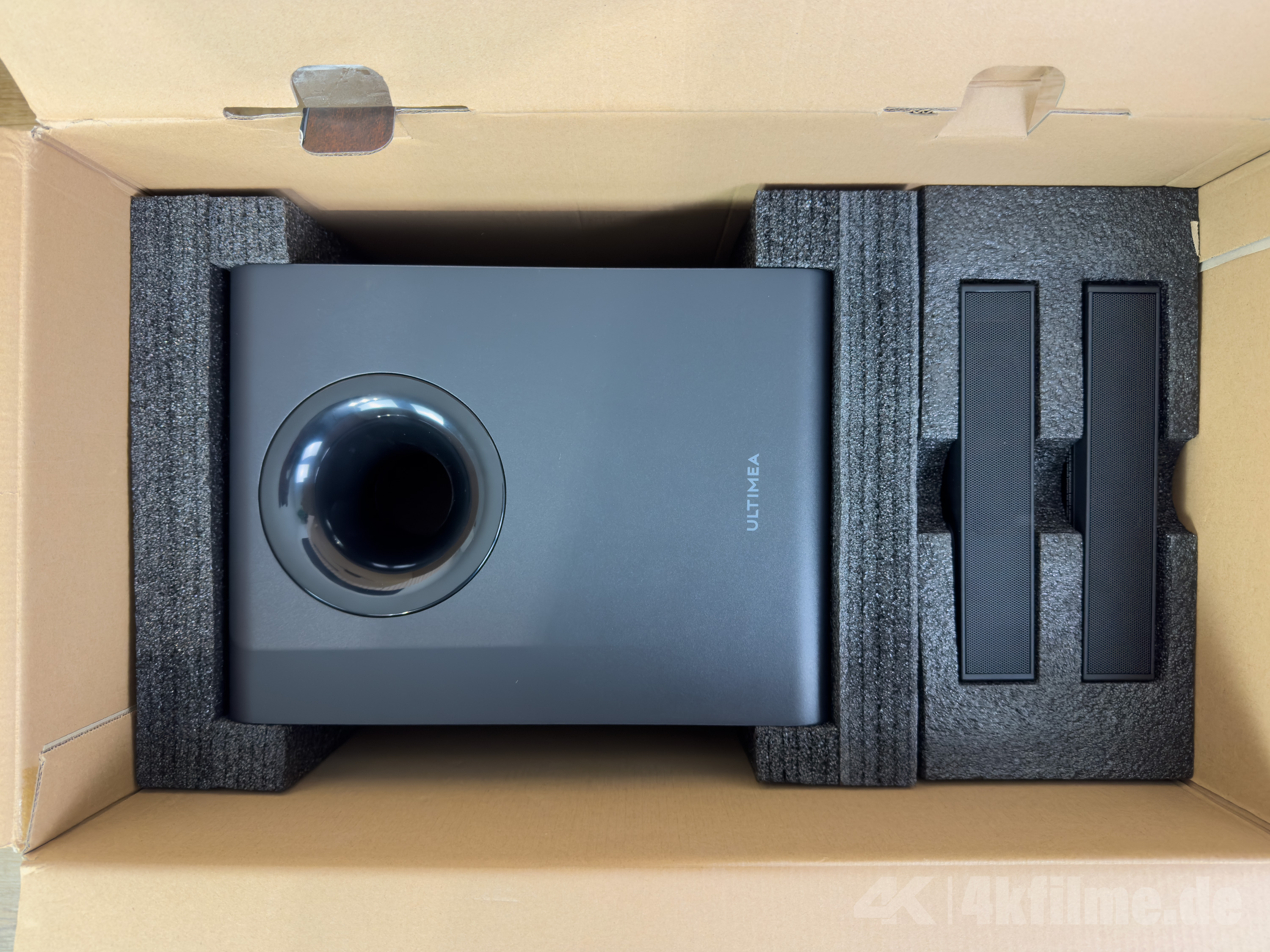 Danach packen wir die Surround-/Rear-Lautsprecher aus, die im Nova S90-Set mit einem zusätzlichen Höhenlautsprecher ausgestattet sind. Diese haben das flaches Design der Soundbar übernommen und messen lediglich 205 x 76 x 38 mm (L x B x H). Zuletzt der Subwoofer, der im Vergleich zum Subwoofer der Ultimea Nova S80 ein ausgedehntes Volumen-Upgrade erfahren hat. Der Tieftöner misst 308 x 237 x 345 mm (L x B x H) und dürfte damit deutlich mehr Schalldruck erzeugen, auch wenn der gleiche 8-Zoll-Treiber verbaut ist (im Vergleich zur Nova S80).