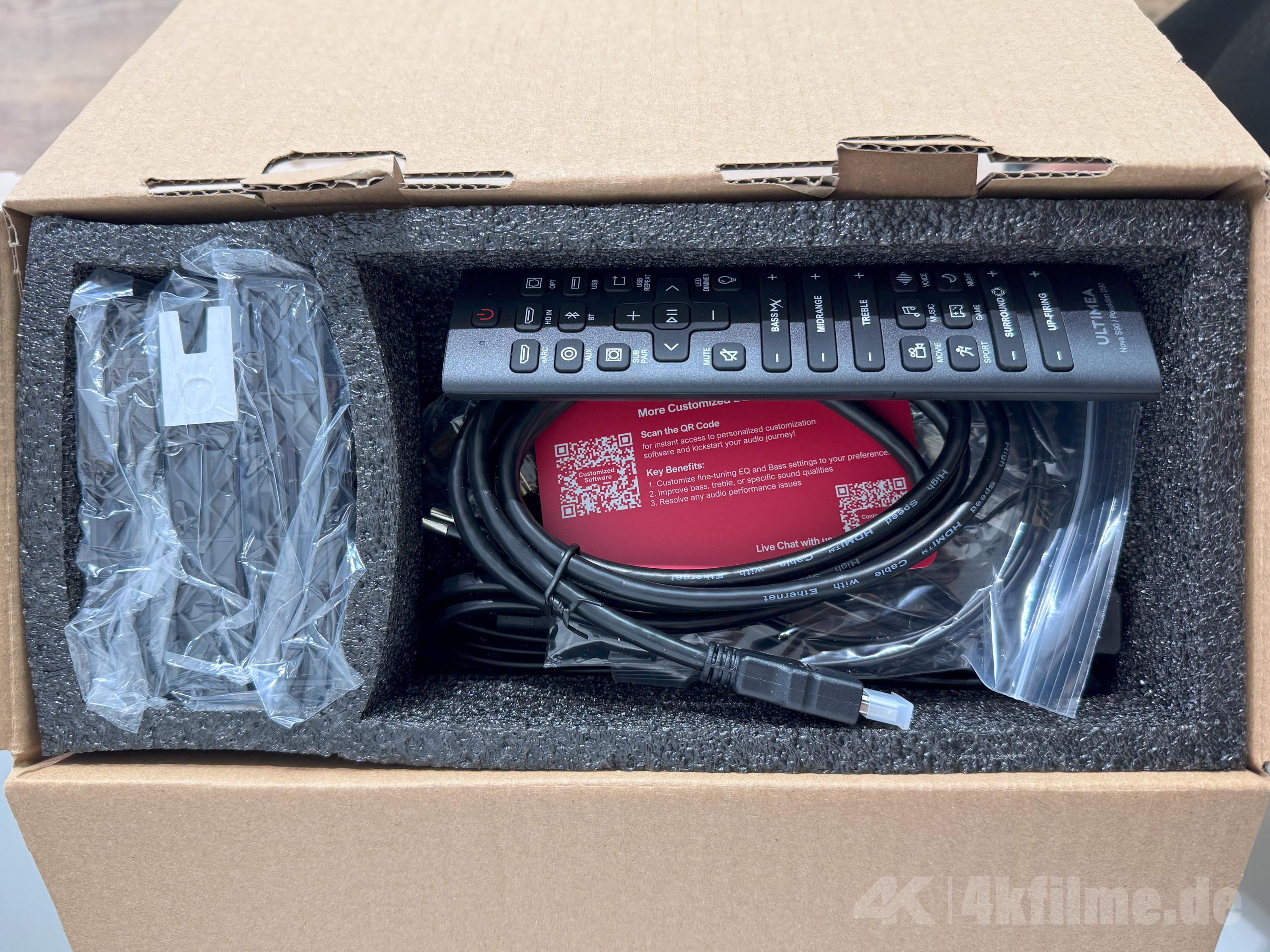 Den Hauptkomponenten liegt noch umfassendes Zubehör bei. Da hätten wir zum einen die für eine reibungslose Funktion benötigten Netzadapter und Verbindungskabel sowie die Fernbedienung, die, wie wir feststellen mussten, eine der einzigen Möglichkeiten darstellt, die Soundbar zu steuern. Dazu gesellen sich noch ein HDMI-Kabel, ein HDMI-Winkel-Adapter, ein optisch-digitales Kabel, ein Wandmontage-Kit, Benutzerhandbuch und ein spezielles 8-poliges-Kabel, mit dem die „Soundbar-Hälften“ verbunden werden. Es fehlen einzig die Batterien für die Fernbedienung. Wobei wir nicht vermuten, dass Ultimea hier zu knauserig für zwei AAA-Batterien ist, sondern das Ganze hat sicherlich etwas mit einer EU-Richtlinie zu tun. Den gesamten Lieferumfang haben wir euch noch im Anschluss an den nächsten Absatz aufgelistet.