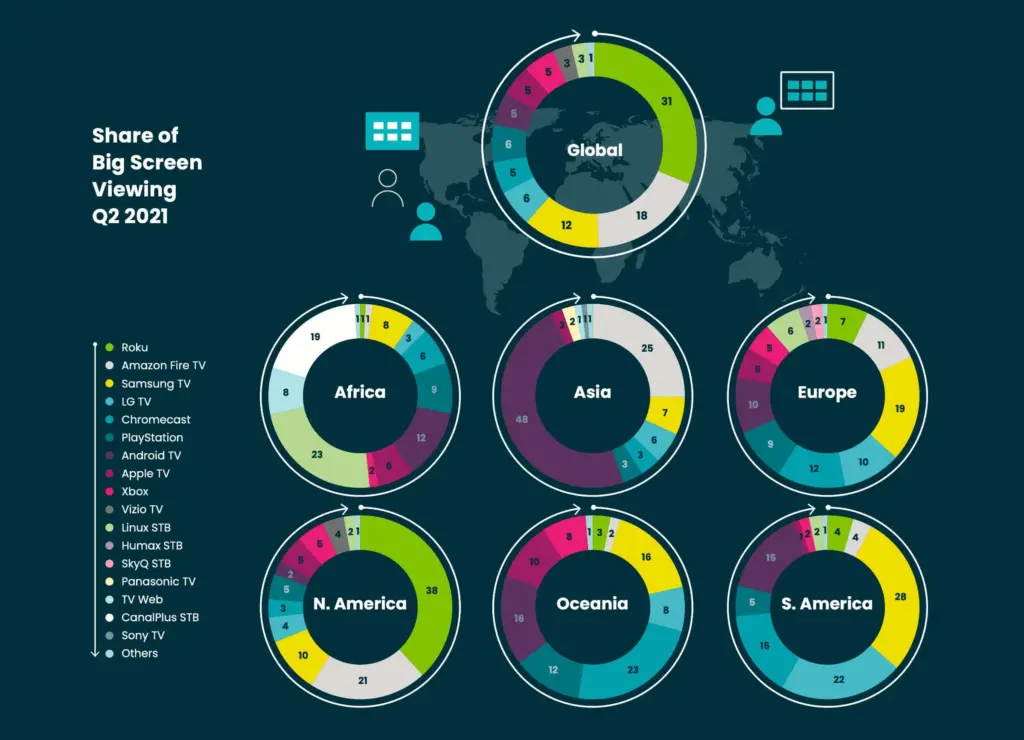 Roku etwa mag in den USA führen, kommt aber z. B. in Asien, Afrika und Südamerika nuf geringe Marktanteile. Zu beachten ist, dass Conviva nicht nur allein TV-Betriebssysteme betrachtet hat, sondern auch Streaming-Player. Daher sichert sich nicht nur Roku hohe Marktanteile bei den Plattformen, auch Amazon mit seinen Fire TV ist international recht weit vorne mit dabei.