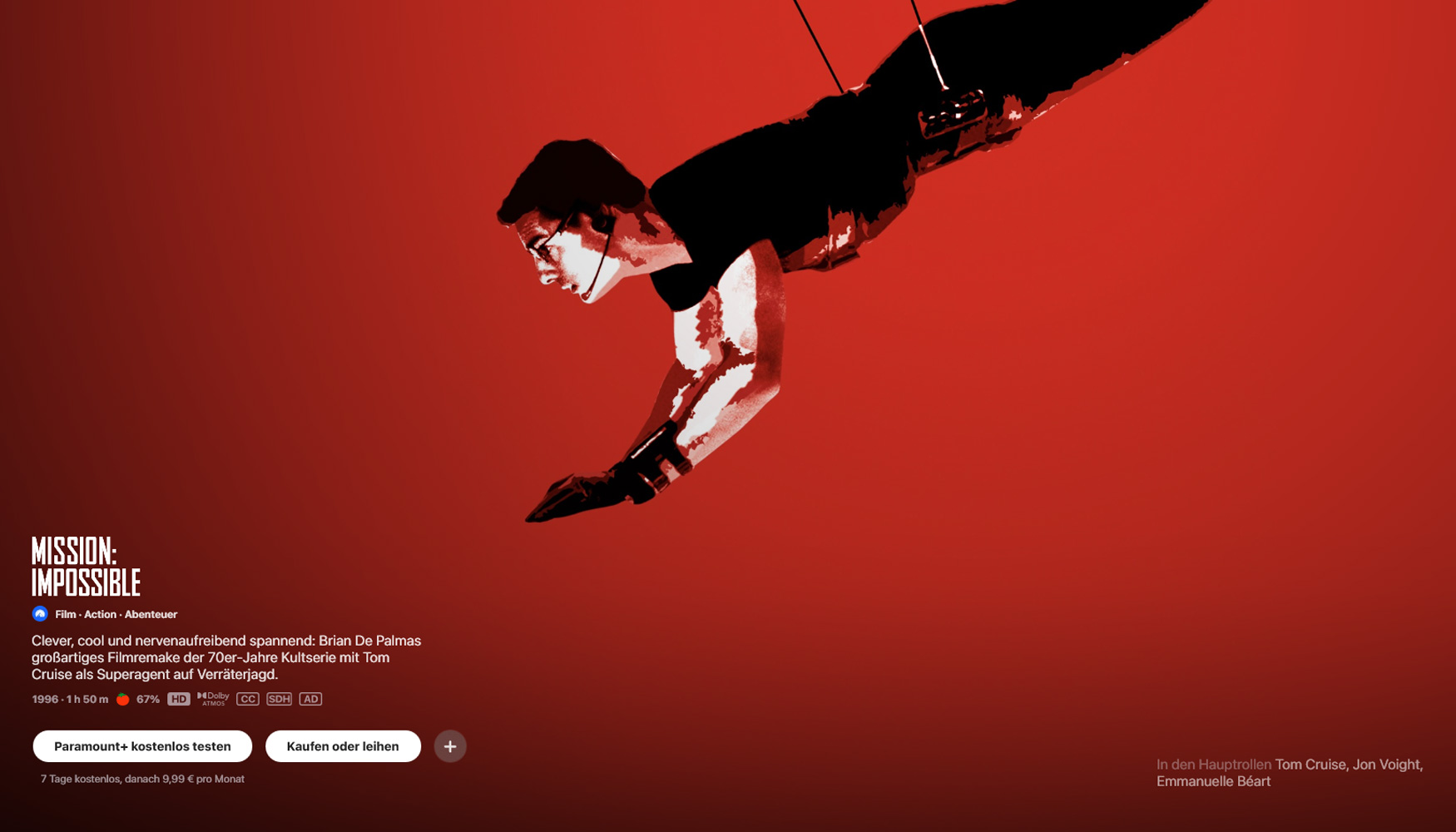 Mit der „Integration“ meinen wir, dass Filme, die auch auf dem Streamingdienst Paramount+ angeboten werden, fortan wohl mit der Konfiguration von Paramount+ beworben werden. Im Standard-Abo von Paramount+ werden Titel wie „Mission: Impossible“, „Star Trek (2009)“, „Scream“ (2022) „Grease“, „Gladiator 2“ uvm. eben in HD-Qualität wiedergegeben. Diese Verknüpfung sorgt derzeit jedoch für Verwirrung bei denjenigen Kunden, die ihre digitalen Filme nur über den Apple TV-Shop beziehen. Zum einen ist nicht mehr erkennbar, welche HDR-Qualitätsmarker zur Verfügung stehen (HDR10, HDR10+ und/oder Dolby Vision), und zum anderen ist nicht auf einen Blick ersichtlich, ob der Film auch in 4K Ultra HD angeboten wird. Lediglich die Audiokonfiguration kann noch korrekt abgerufen werden.