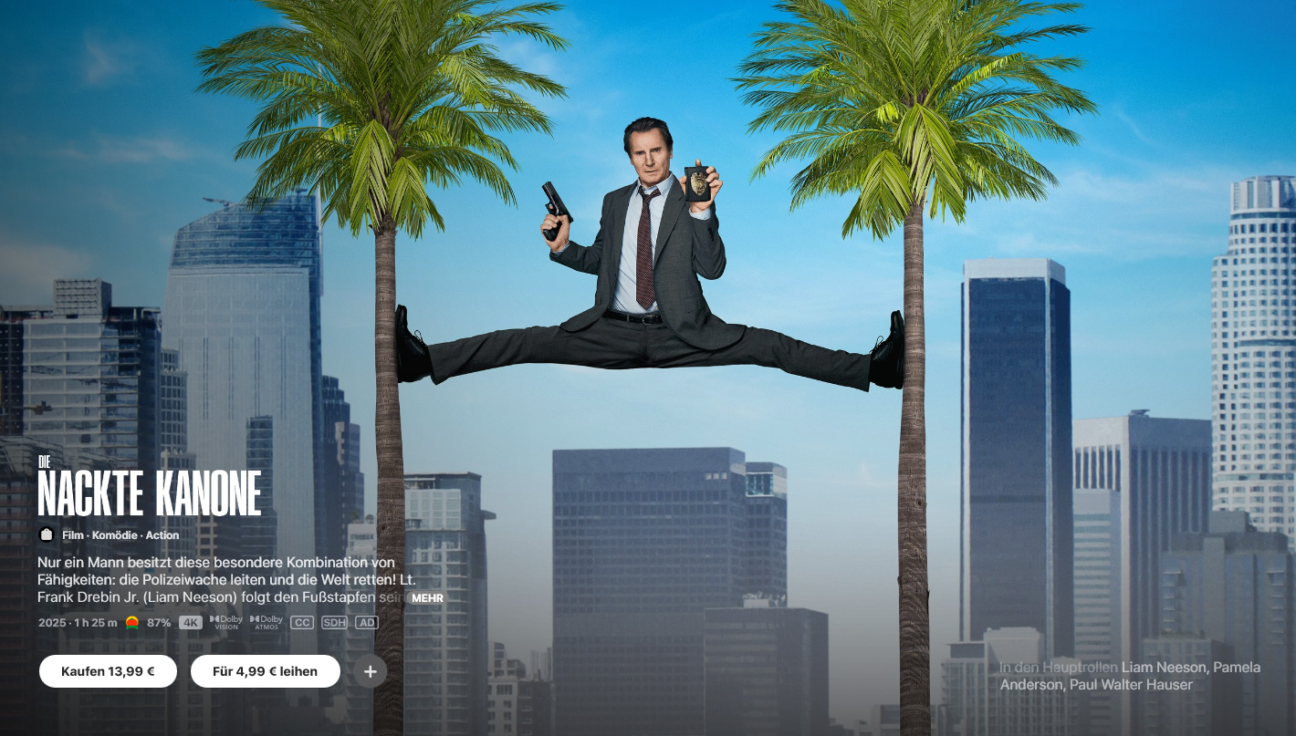 Die Nackte Kanone (2025) mit Liam Neeson steht noch nicht auf Paramount+ zum Stream bereit und somit werden alle Detailangaben der Apple-TV-Variante korrekt ausgegeben (4K, Dolby Vision, Dolby Atmos…).