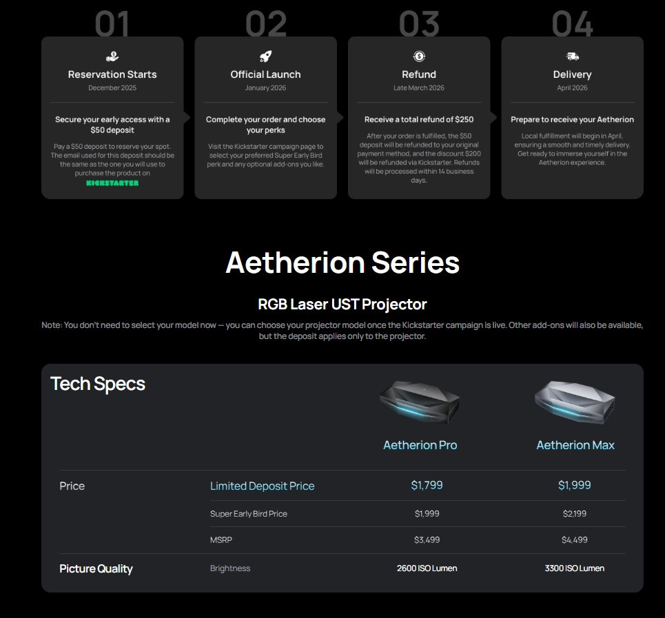 AWOL hat bereits zur Ankündigung der neuen Modelle die Preise und Starttermine kommuniziert. Über die hauseigene Kickstarter-Kampagne (mit 200 $US Preisvorteil) wurde kommuniziert, dass der offizielle Launch im Januar 2026 (CES 2026) stattfinden soll. Im April 2026 sollen die 4K-Laser-UST-Projektoren dann an die Vorbesteller ausgeliefert werden. Bis kurz vor der Auslieferung ist lediglich eine Kaution von 50 $US fällig, die dann zusammen mit dem Preisvorteil im April zurückerstattet wird. Für den Aetherion Pro mit 2.600 ISO-Lumen verlangt der Hersteller 1.999 $US (1.799 $US Kickstarter-Vorteilspreis) und für den Aetherion Max sind es 2.199 $US (1.999 $US Kickstarter-Vorteilspreis). Anhand dieser Vorgaben sollte man sich einen groben Anschaffungspreis in Euro für den deutschsprachigen Raum herausarbeiten können.