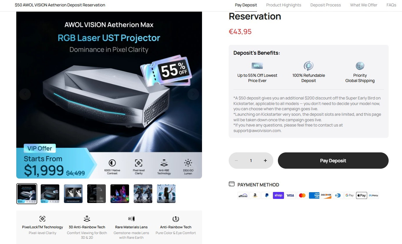 AWOL hat bereits zur Ankündigung der neuen Modelle die Preise und Starttermine kommuniziert. Über die hauseigene Kickstarter-Kampagne (mit 200 $US Preisvorteil) wurde kommuniziert, dass der offizielle Launch im Januar 2026 (CES 2026) stattfinden soll. Im April 2026 sollen die 4K-Laser-UST-Projektoren dann an die Vorbesteller ausgeliefert werden. Bis kurz vor der Auslieferung ist lediglich eine Kaution von 50 $US fällig, die dann zusammen mit dem Preisvorteil im April zurückerstattet wird. Für den Aetherion Pro mit 2.600 ISO-Lumen verlangt der Hersteller 1.999 $US (1.799 $US Kickstarter-Vorteilspreis) und für den Aetherion Max sind es 2.199 $US (1.999 $US Kickstarter-Vorteilspreis). Anhand dieser Vorgaben sollte man sich einen groben Anschaffungspreis in Euro für den deutschsprachigen Raum herausarbeiten können.