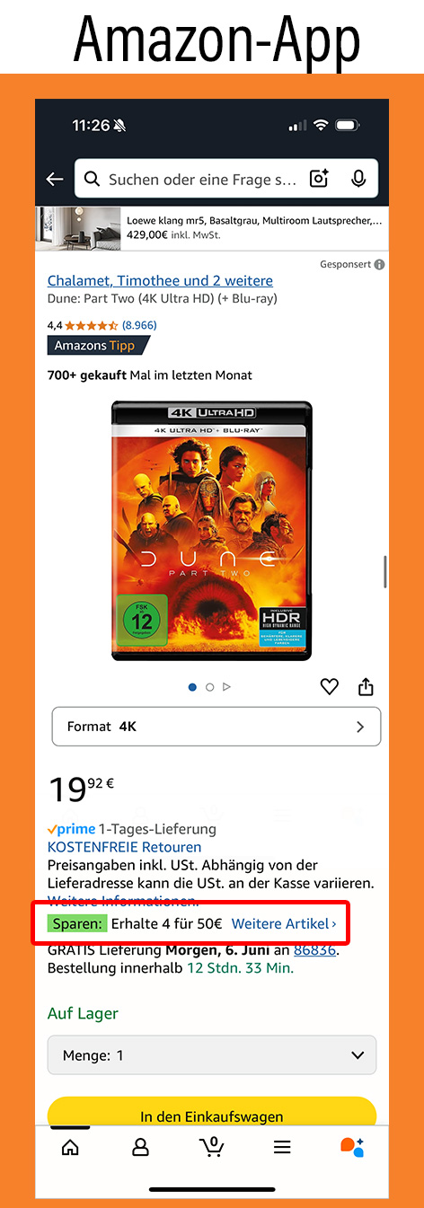 1. Ich finde den Knopf mit „weitere Artikel“ nicht. Habe ich noch nie. Liegt es daran, dass es bei mir in die Amazon App springt, wenn ich auf den Link klicke? ☹️