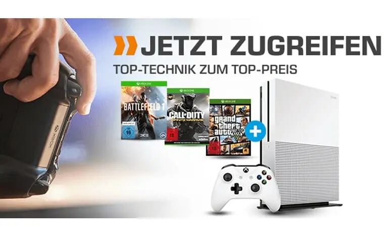 Knaller-Angebot auf Saturn.de. Die neue XBOX ONE S mit 4K Blu-ray Laufwerk und drei Action-Knallern (Battlefiel 1, Call of Duty: Infinite Warfare, GTA V) im Bundle Preis für nur 299 Euro!