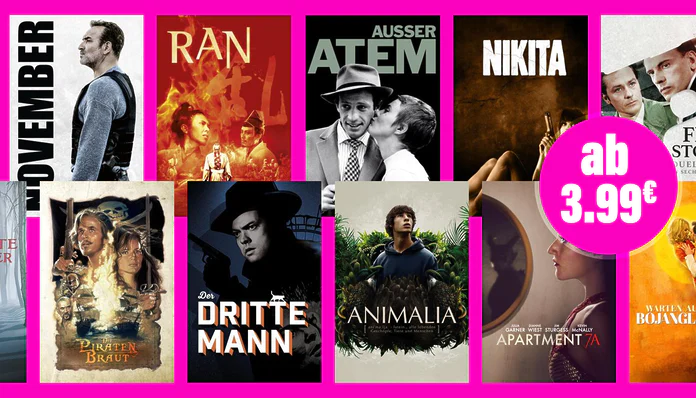 Es lohnt sich auf jeden Fall, einmal die Auswahl preisreduzierter 4K-Filme ab 3.99 Euro durchzusehen. Darin findet ihr viele Titel (vor allem Filmklassiker), mit denen sich Lücken in eurer digitalen Filmsammlung kostengünstig schließen lassen. Darunter z.B. „Nikita“ mit Anne Parillaud und Jean Reno, „Ausser Atem„, der Schwarz-Weiß-Klasisker von 1960, „Die Piratenbraut“ mit Geena Davis, oder das Japan-Drama „RAN„. Es gibt aber auch „frischere“ Filme wie das Action-Drama „November„, den Action-Thriller „Animalia“ oder den Horrorschocker „Apartment 7A„.