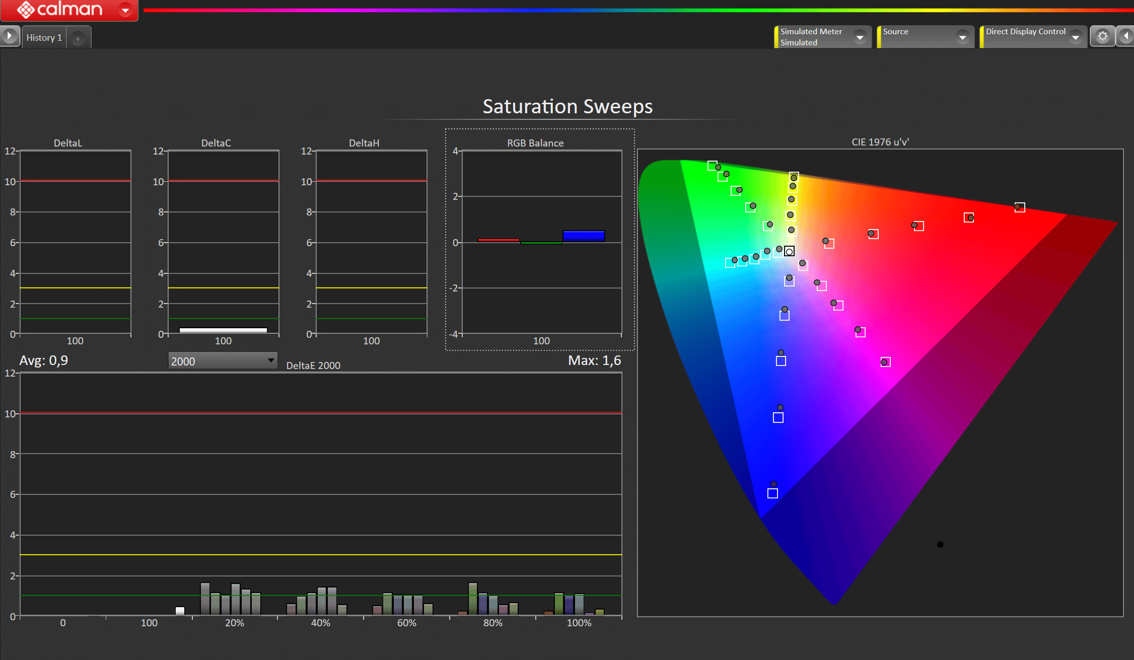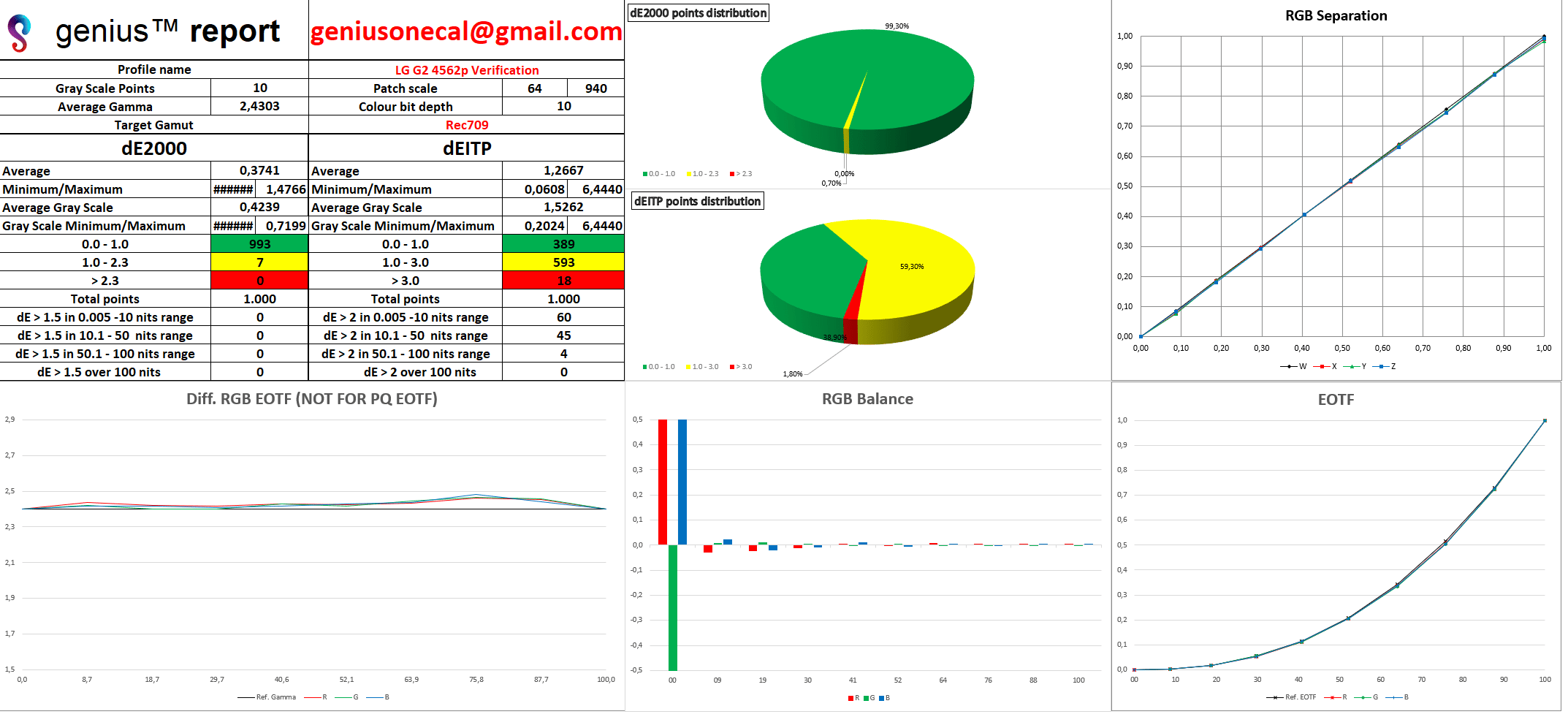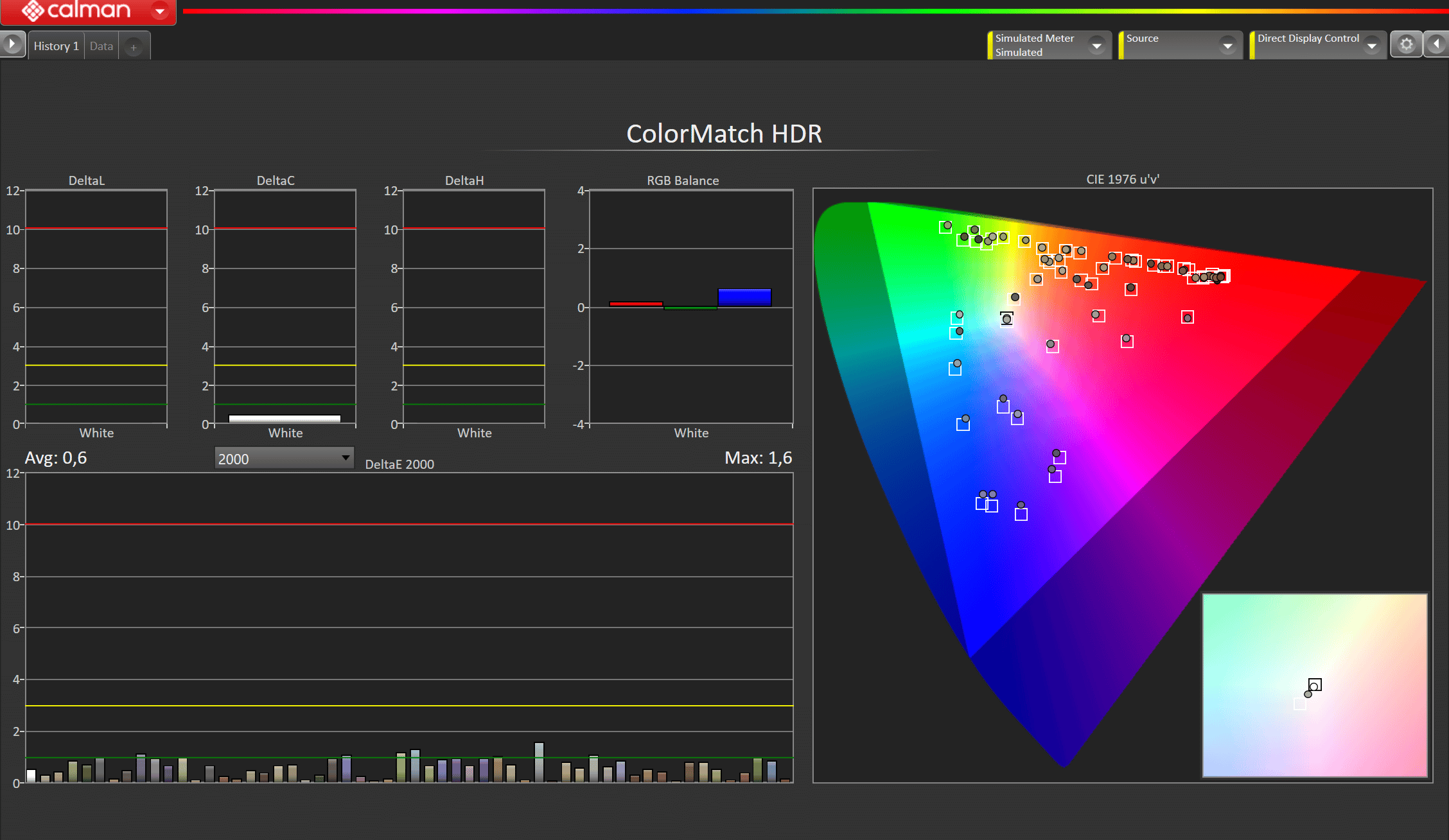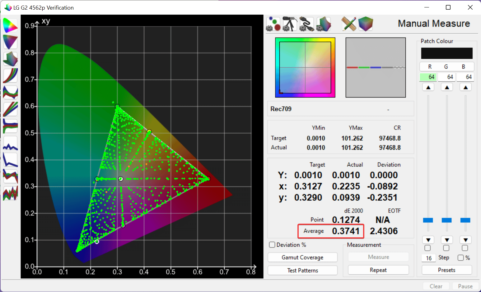 Wie bereits bei den Modellen der vergangenen Jahre bietet auch der G2 technisch versierten Anwendern mit dem entsprechenden Equipment das allerletzte Prozent Bildqualität herauszukitzeln. Nach der Verifizierung von 1.000 Messpunkten ergibt sich folgendes Endresultat. Ich denke Bilder sagen manchmal mehr als viele Worte. Um einen der wichtigsten Messwerte bei all diesen Diagrammen in Fokus zu rücken, habe ich diesen mit einem roten Rahmen versehen. Der durchschnittliche dE2000 Wert der 1.000 Messpunkte des G2 ergab sagenhafte 0,37 und lediglich 7 Punkte sind > 1 dE, mit einem Maximalwert von 1.47 dE. Ein Traumwert für jeden Kalibrierer, was nicht nur auf dem Papier, sondern auch auf dem Bildschirm für Staunen sorgt. Nochmals zur Erinnerung alles, was unterhalb von 3.0 dE liegt, kann von dem menschlichen Auge nicht als Fehler wahrgenommen werden.