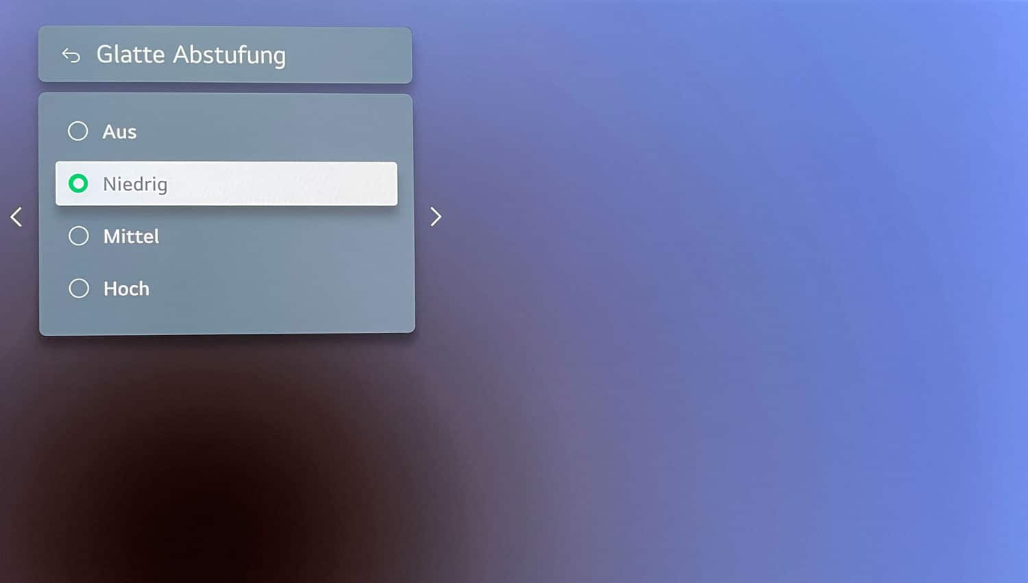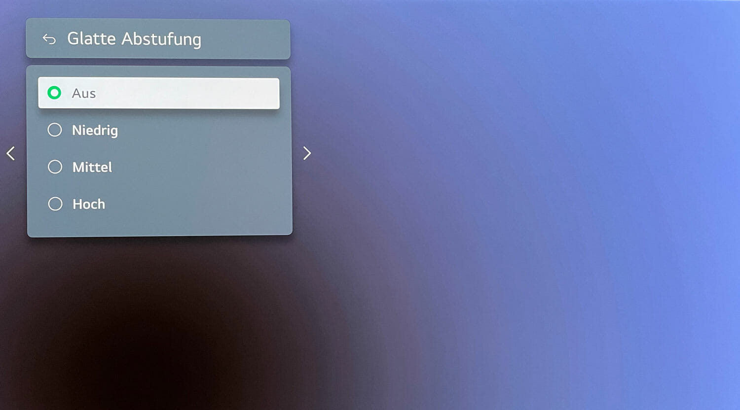 Als Bild-Purist verzichte ich selbstverständlich auf jegliche Art von „Bildverbesserer“ jedoch besitzt der LG eine tolle Option, um Banding-Artefakte zu reduzieren. Das sind diese lästigen Farbübergänge, die sich vor allem bei Farbverläufen z.B. bei der Darstellung des Himmels bemerkbar machen. Dies funktioniert in der Praxis bereits auf der geringsten Einstellung hervorragend, ohne dabei das Bild zu sehr zu verfälschen. Wie man auf dem Testbild hervorragend erkennen kann, wird das Banding rund um den dunklen Kreis merklich reduziert. Der Unterschied wird auf den Stufen „Mittel“ und „Hoch“ nicht besser und verursacht lediglich durch das enorme Weichzeichnen, dass Details im Bild verloren gehen und ist somit nicht zu empfehlen.